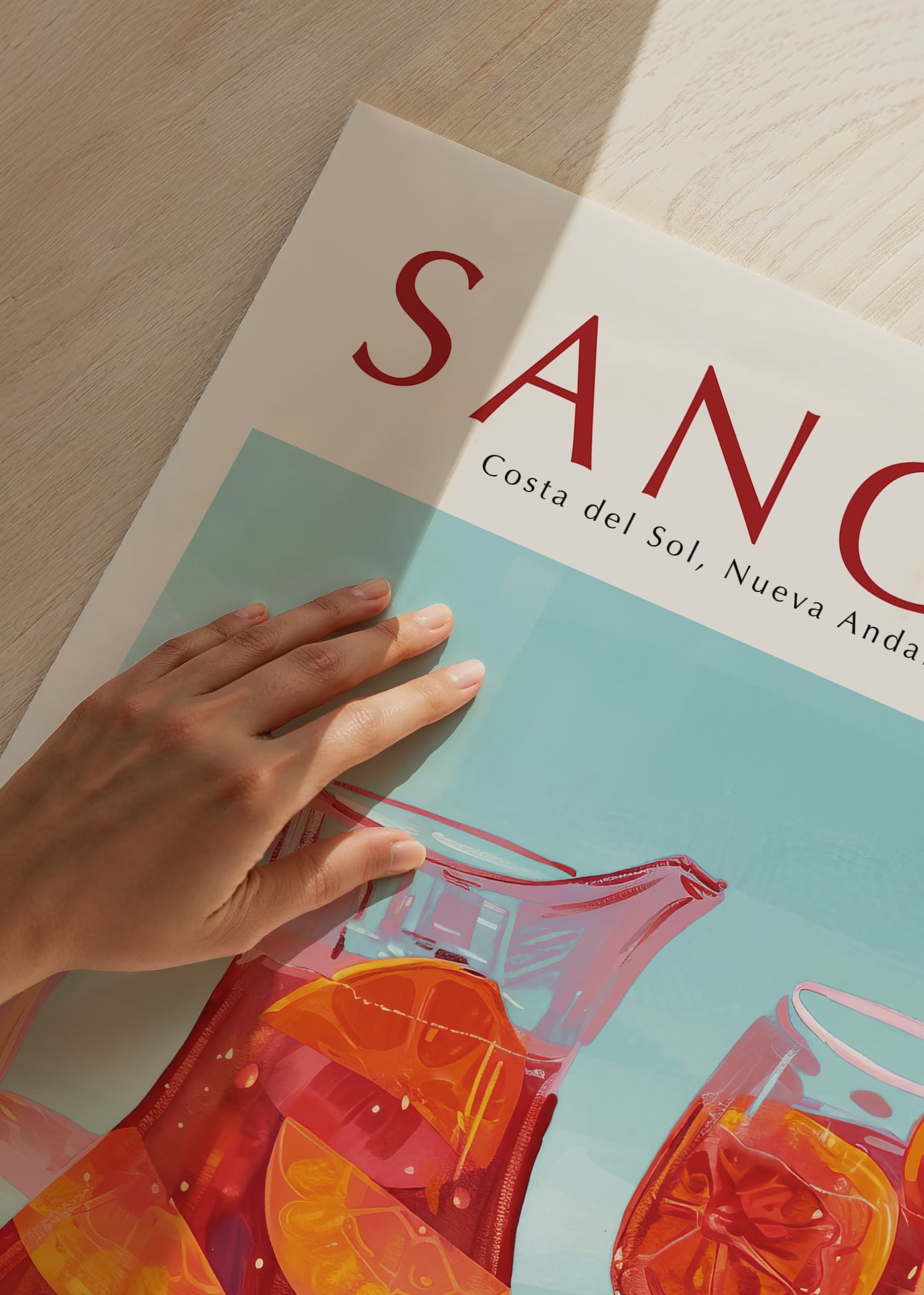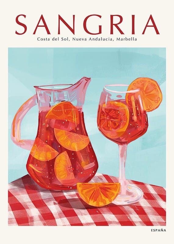 Capture the essence of Spanish summer and indulgence with our vibrant poster depicting a jug and glass of Sangria, full of juicy orange slices, against a backdrop of clear blue sky. This illustration exudes a sense of celebration and warmth, perfect for brightening up your kitchen, dining room or patio. The red-white-checkered canvas and bright colors create an authentic and inviting atmosphere that evokes memories of sunny days on the Costa del Sol.