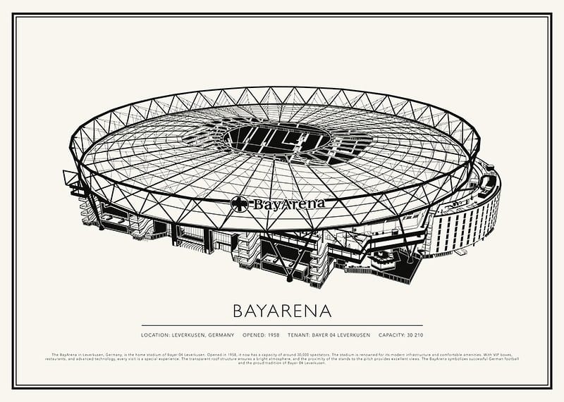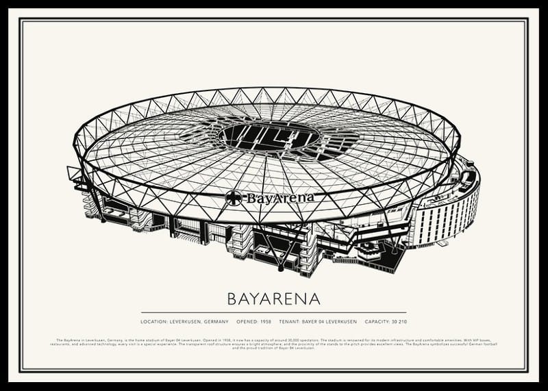 The BayArena in Leverkusen, Germany, is the home stadium of Bayer 04 Leverkusen. Opened in 1958, it now has a capacity of around 30,000 spectators. The stadium is renowned for its modern infrastructure and comfortable amenities. With VIP boxes, restaurants, and advanced technology, every visit is a special experience. The transparent roof structure ensures a bright atmosphere, and the proximity of the stands to the pitch provides excellent views. The BayArena symbolizes successful German football and the proud tradition of Bayer 04 Leverkusen.