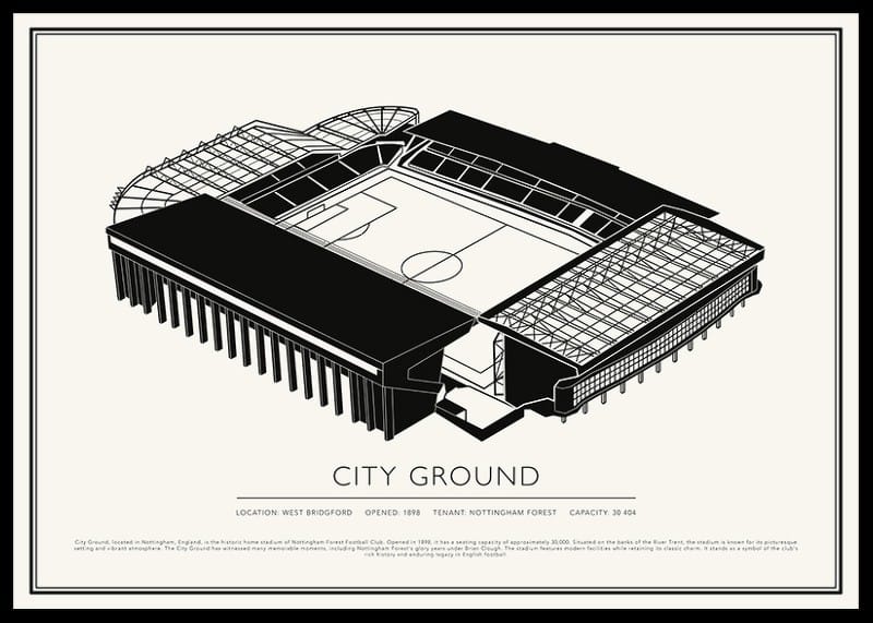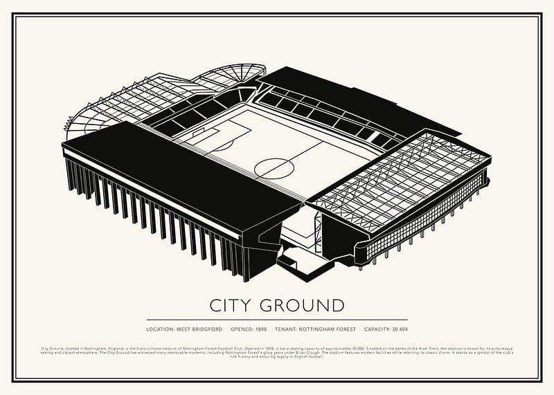 City Ground, located in Nottingham, England, is the historic home stadium of Nottingham Forest Football Club. Opened in 1898, it has a seating capacity of approximately 30,000. Situated on the banks of the River Trent, the stadium is known for its picturesque setting and vibrant atmosphere. The City Ground has witnessed many memorable moments, including Nottingham Forest's glory years under Brian Clough. The stadium features modern facilities while retaining its classic charm. It stands as a symbol of the club's rich history and enduring legacy in English football.