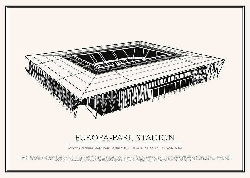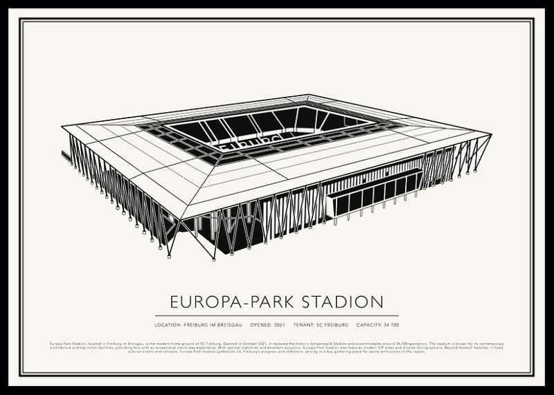 Europa-Park Stadion, located in Freiburg im Breisgau, is the modern home ground of SC Freiburg. Opened in October 2021, it replaced the historic Schwarzwald-Stadion and accommodates around 34,700 spectators. The stadium is known for its contemporary architecture and top-notch facilities, providing fans with an exceptional match-day experience. With optimal sightlines and excellent acoustics, Europa-Park Stadion also features modern VIP areas and diverse dining options. Beyond football matches, it hosts cultural events and concerts. Europa-Park Stadion symbolizes SC Freiburg's progress and ambitions, serving as a key gathering place for sports enthusiasts in the region.