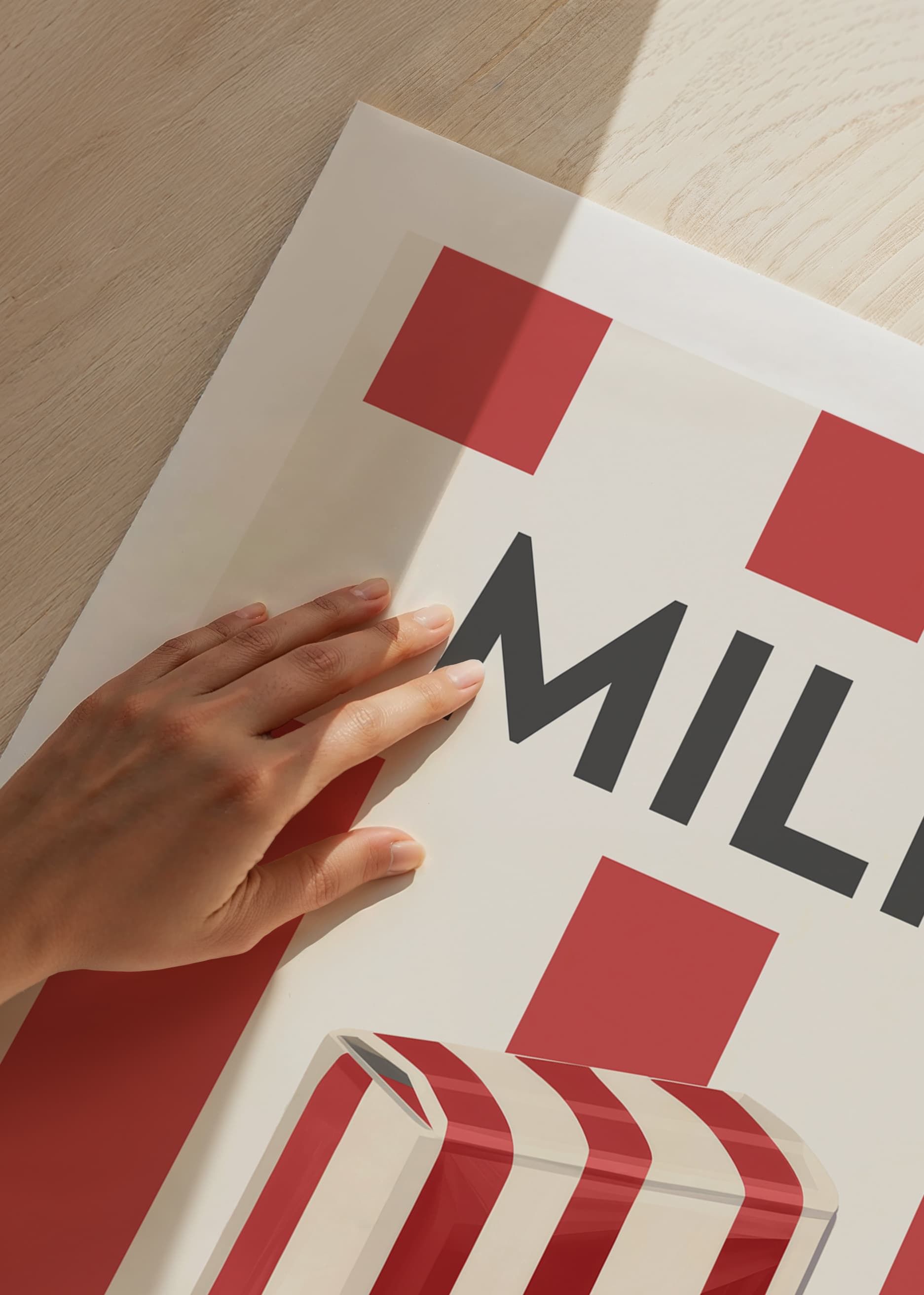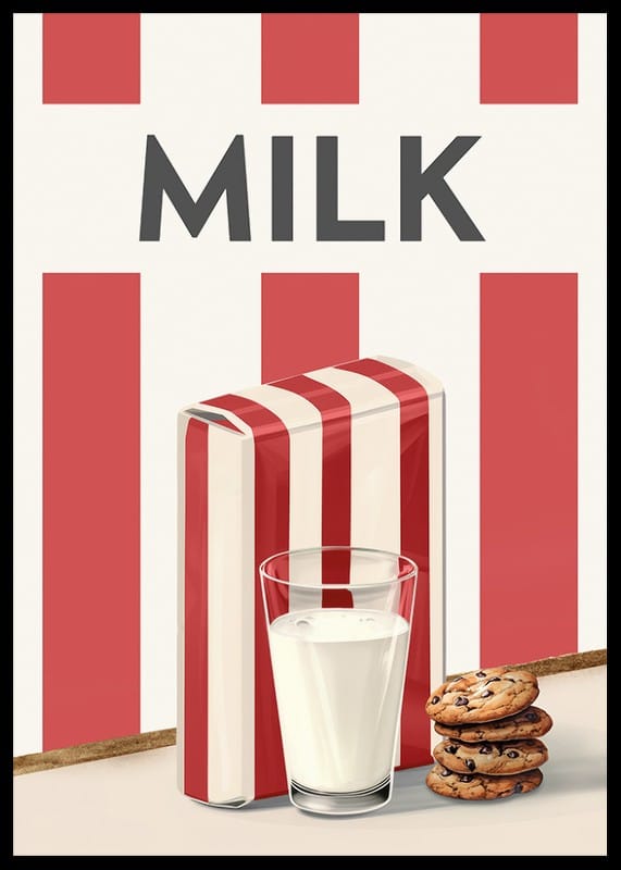 Experience Scandinavian simplicity and retro charm with this stylish poster featuring a watercolor painting of milk. This illustration captures the timelessness of a glass of cold milk, served with chocolate chip cookies, next to a milk carton decorated with classic red and white stripes. The minimalist design and the harmonious color palette make this poster a perfect detail in the kitchen or dining room. A tribute to everyday pleasures, which conveys the feeling of homeliness and good times.