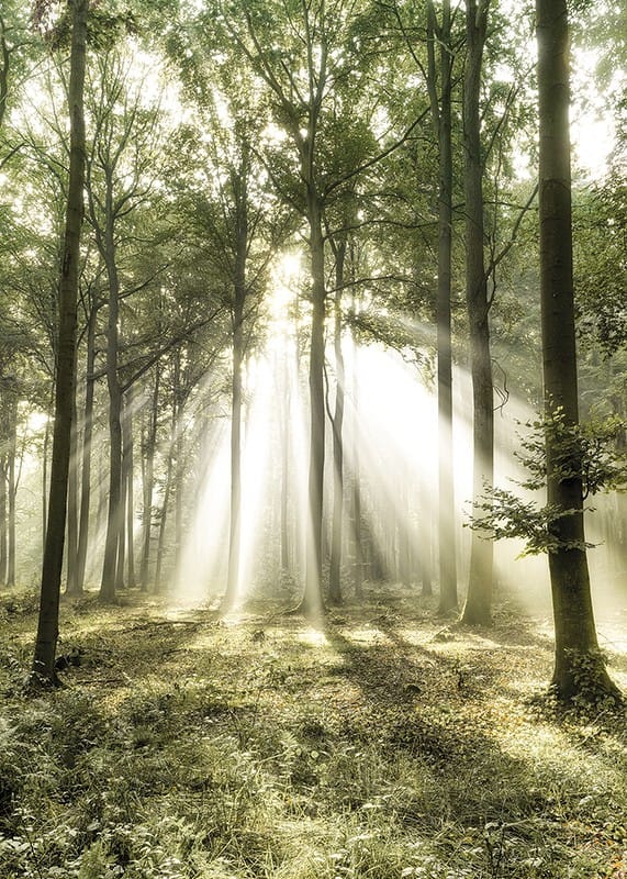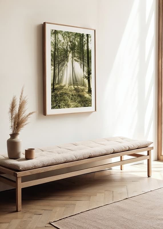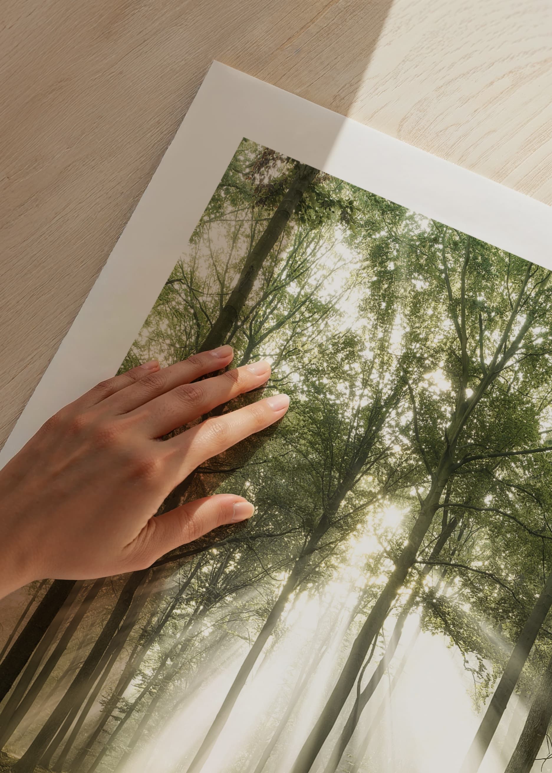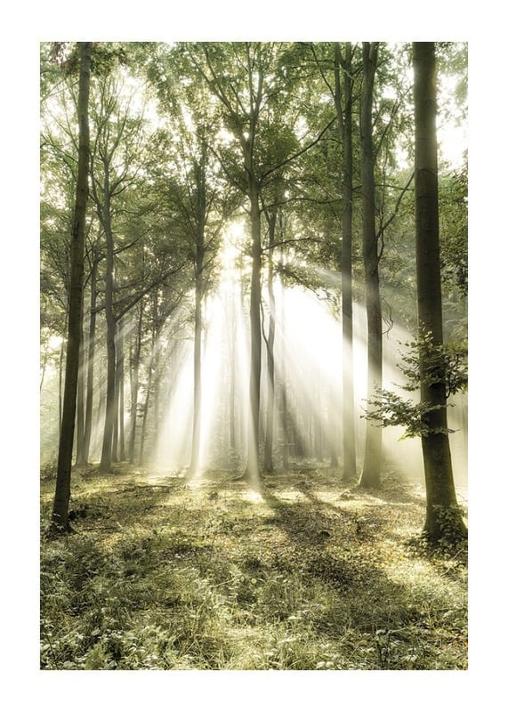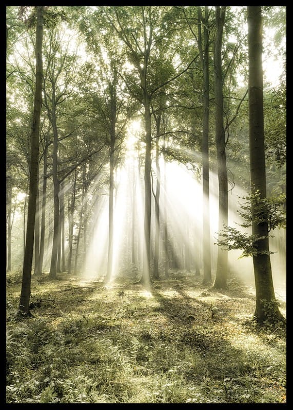 This poster captures a magical morning in the forest, where the sun's rays break through the dense foliage and create a beautiful play of light and shadows. The tall trees rise majestically, while the soft light spreads a sense of peace and quiet over the woodland. The misty atmosphere and long shadows enhance the impression of an enchanted place, perfect for bringing a sense of natural peace and mystery to your home.