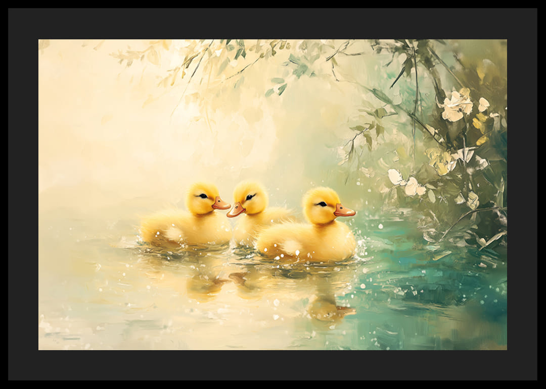 Fill your home with charm and joy with this wonderful poster. The image shows three fluffy ducklings gliding along on a still water surrounded by soft flowers and warm rays of light. With its bright colors and peaceful atmosphere, it radiates innocence and the magic of spring. Perfect for spreading warmth and harmony in your home - a motif loved by both children and adults.