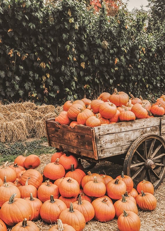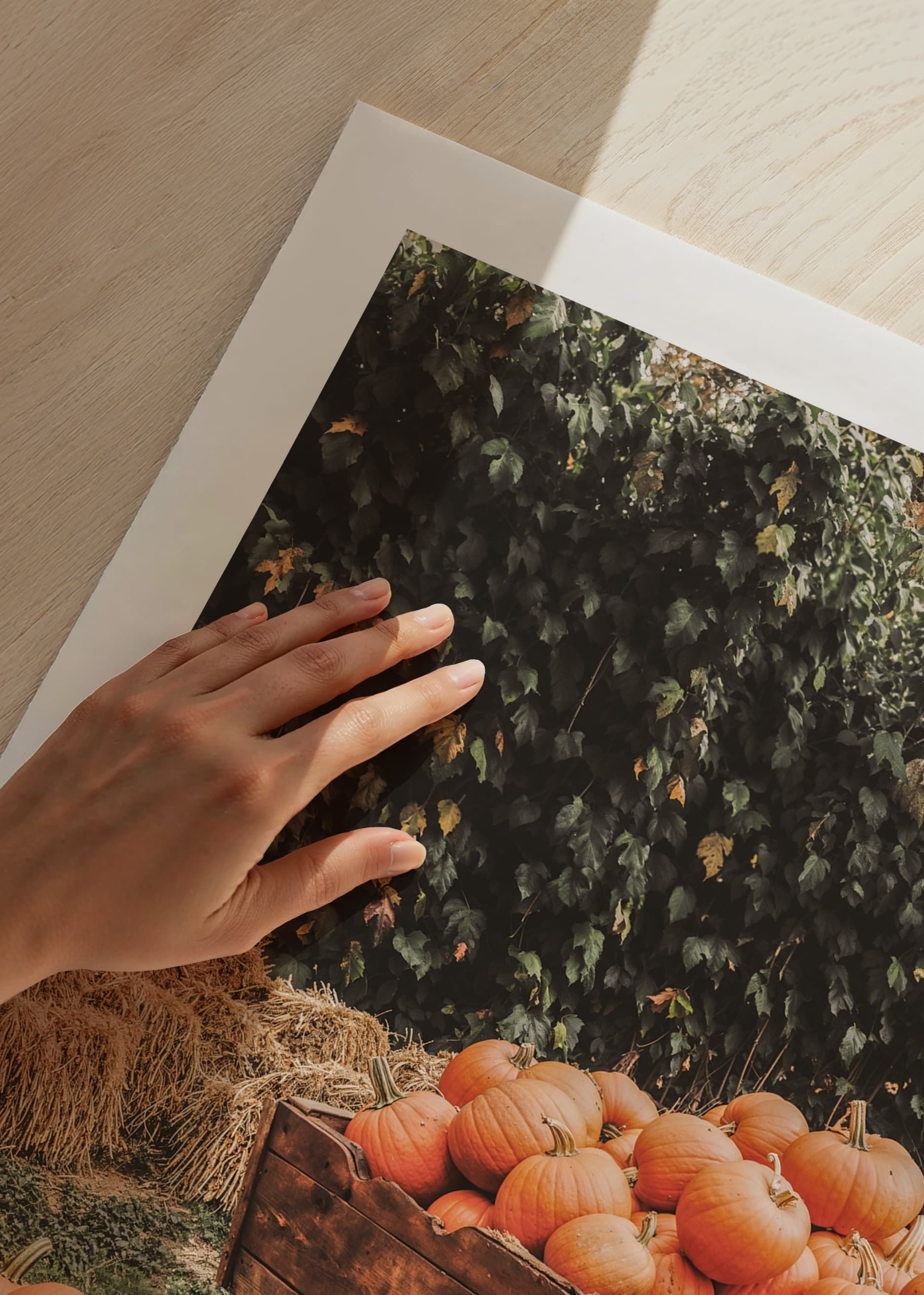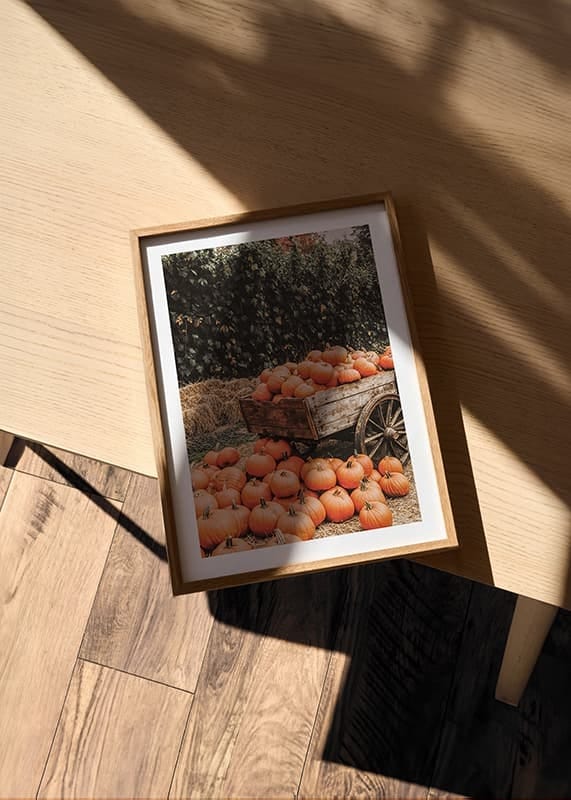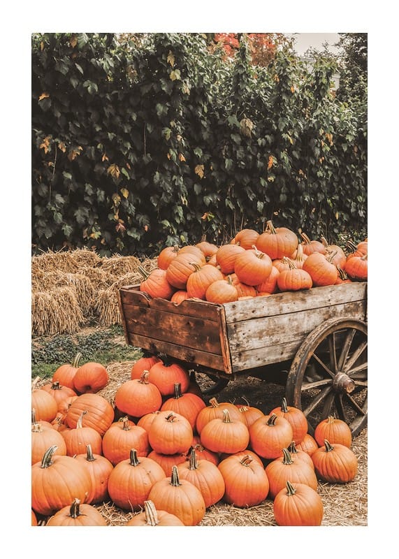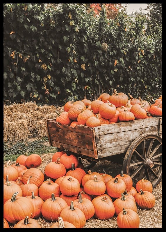 This poster shows a charming autumn scene with an old fashioned wooden cart filled to the brim with freshly harvested pumpkins. The bright orange tones of the pumpkins contrast beautifully with the rustic wood of the sheaf and the straw that surrounds them. The lush background of greenery and straw bales gives the picture a feeling of rural harvest time. A perfect poster to create a warm and inviting autumn feeling in your home.