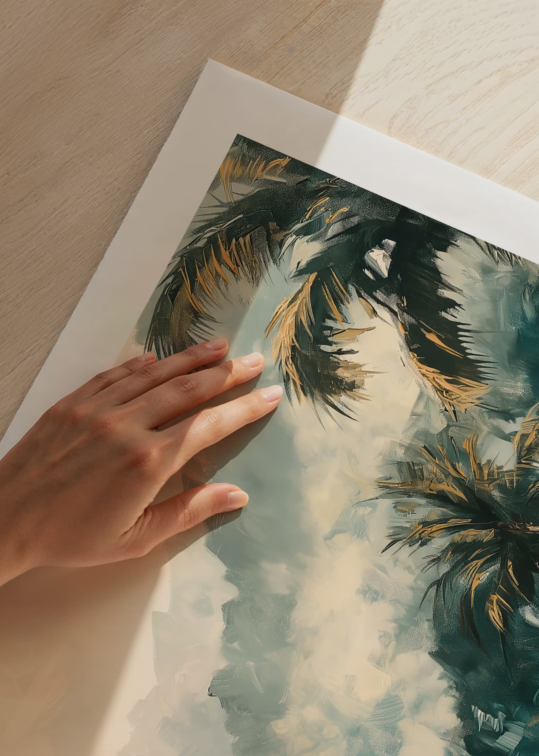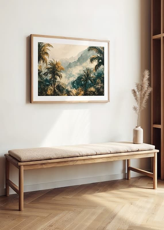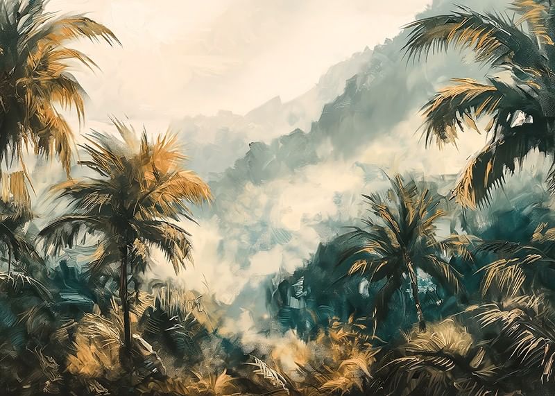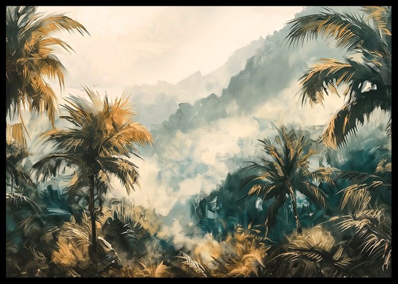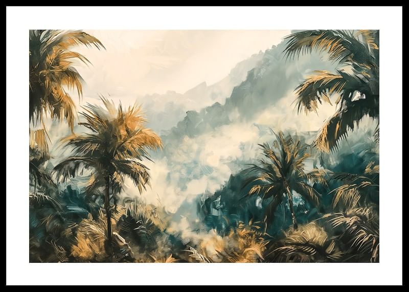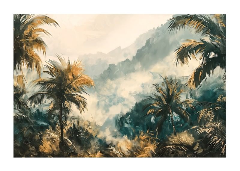 Lose yourself in a dreamy world with this atmospheric poster of a mist-shrouded tropical jungle. The soft rays of sunlight filter through the palm foliage, while the deep greenery and golden tones create a sense of adventure and harmony.