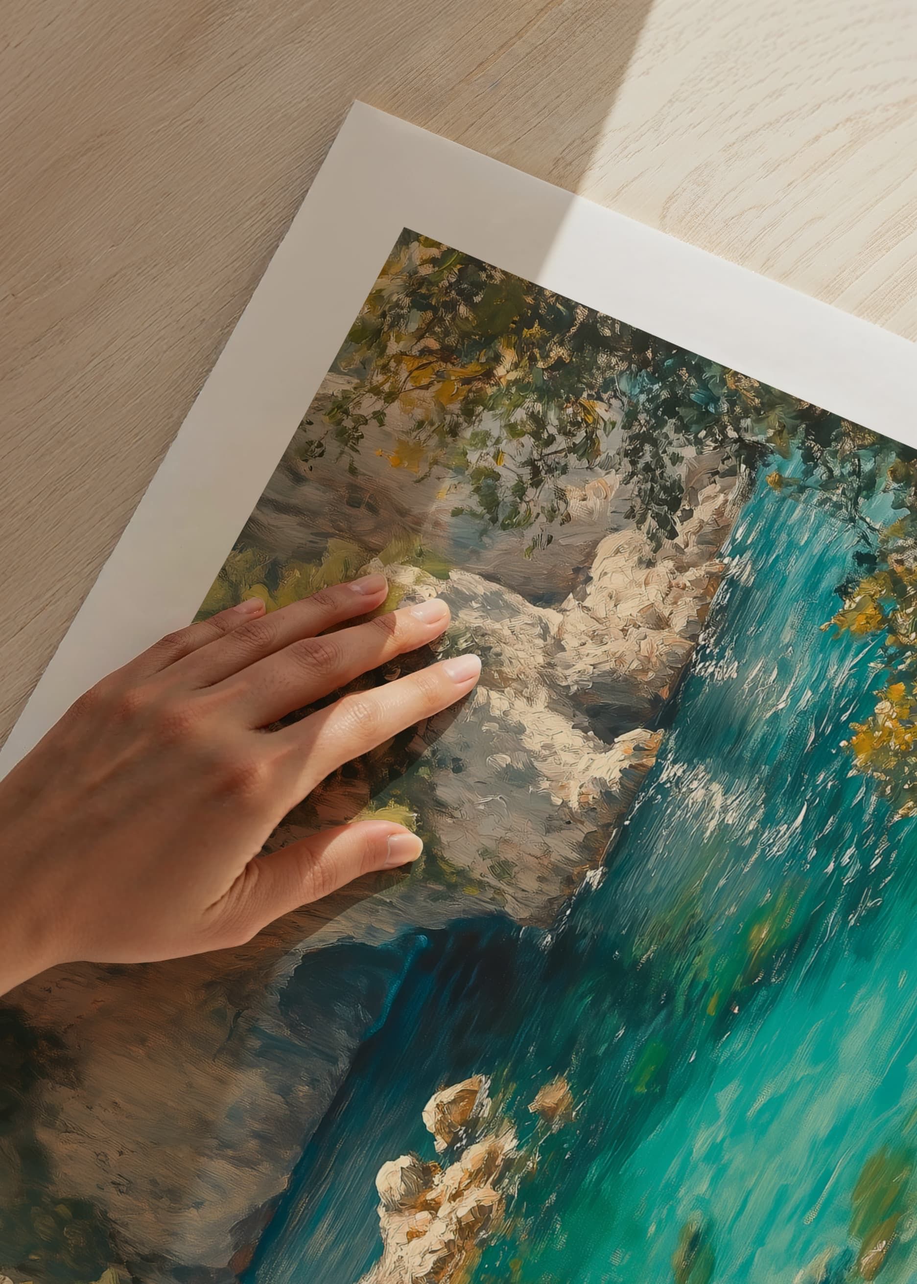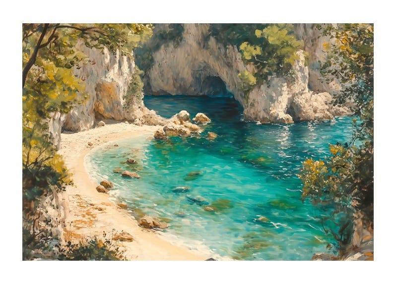 Discover a pristine paradise beach with this enchanting poster. The crystal clear, turquoise water sparkles between the rocks, while greenery frames the golden sand. A place of tranquility and beauty.