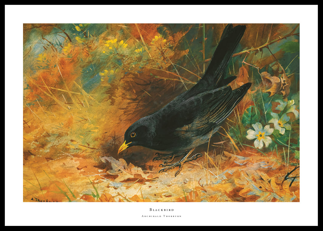 Poster from the famous artists category featuring the painting "Blackbird" by Scottish artist Archibald Thorburn from 1928.