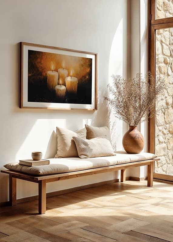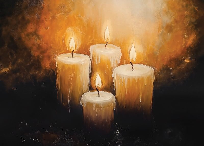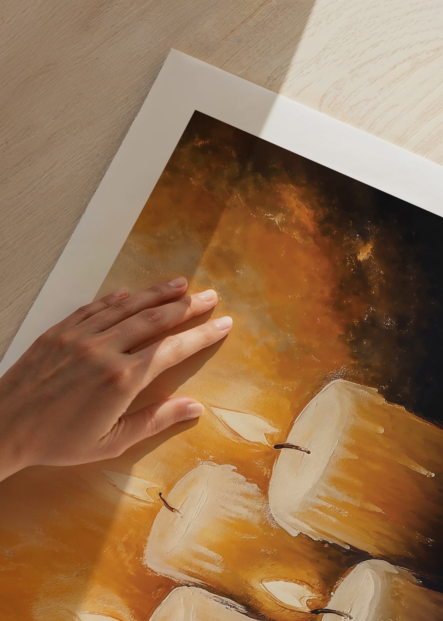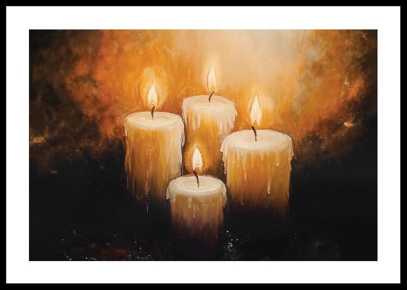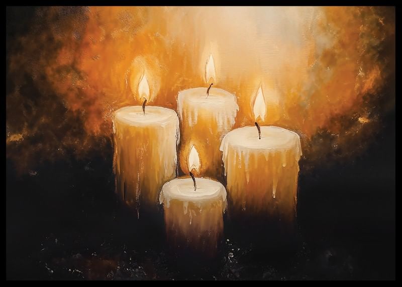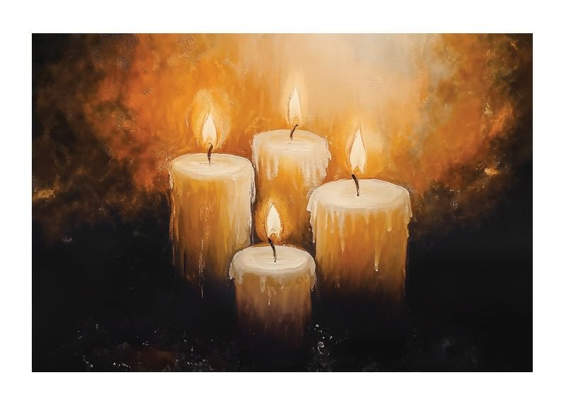 Create a warm and peaceful atmosphere with this poster depicting four sparkling candles that emit a soft, golden glow. The atmospheric background and the beautiful flames symbolize stillness, warmth and harmony. Perfect for transforming your home into a peaceful and inviting place, this poster is a celebration of the magic and calming power of light