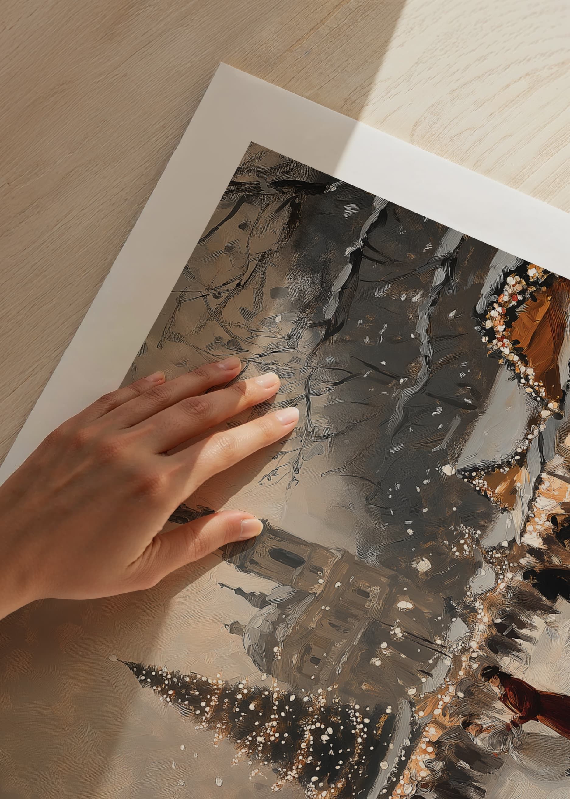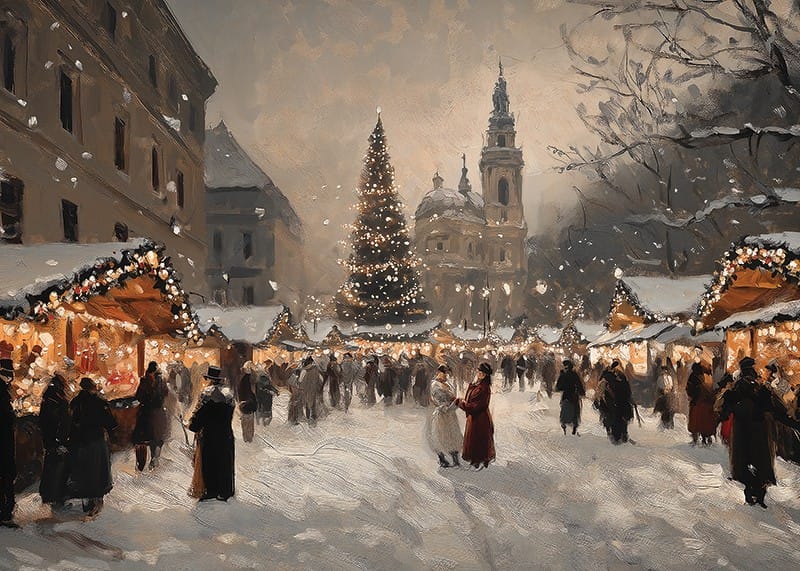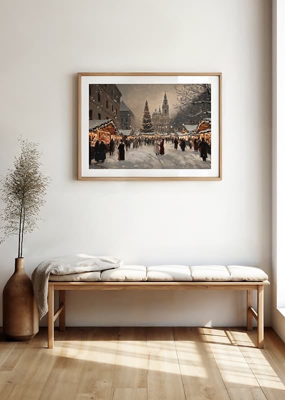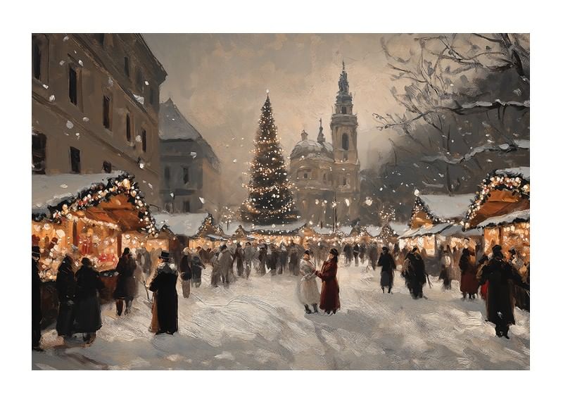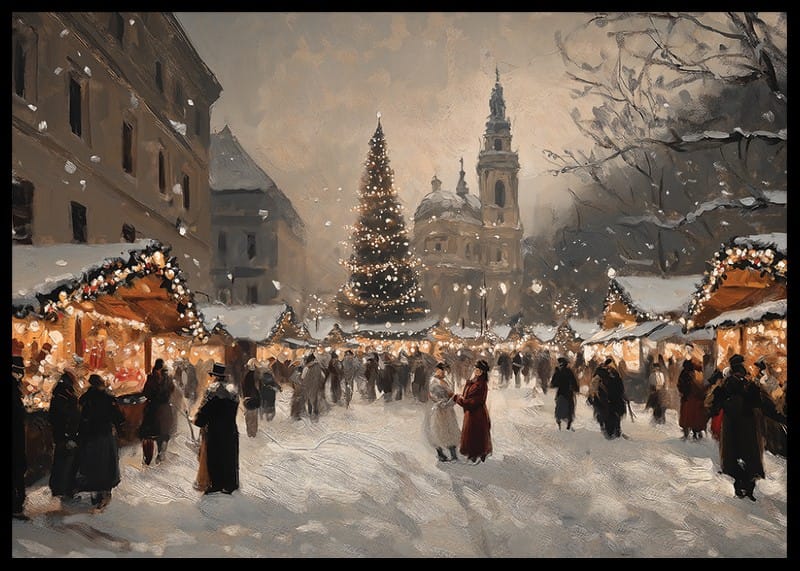 Capture the magic of Christmas with this poster depicting a lively and charming Christmas market covered in sparkling snow. Decorated stalls, light-clad trees and an impressive Christmas tree create a warm and festive atmosphere in the middle of the winter evening. Perfect for spreading holiday cheer and nostalgia, this poster is a timeless celebration of the beauty and community of Christmas