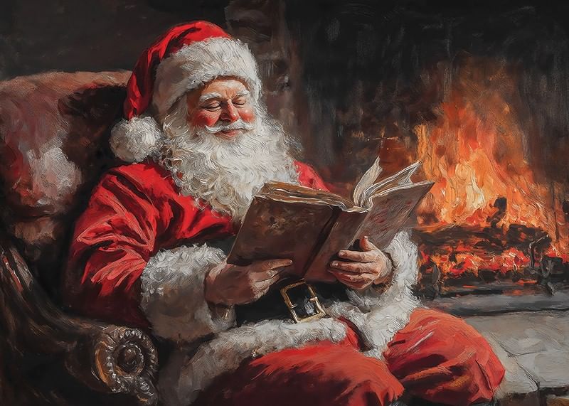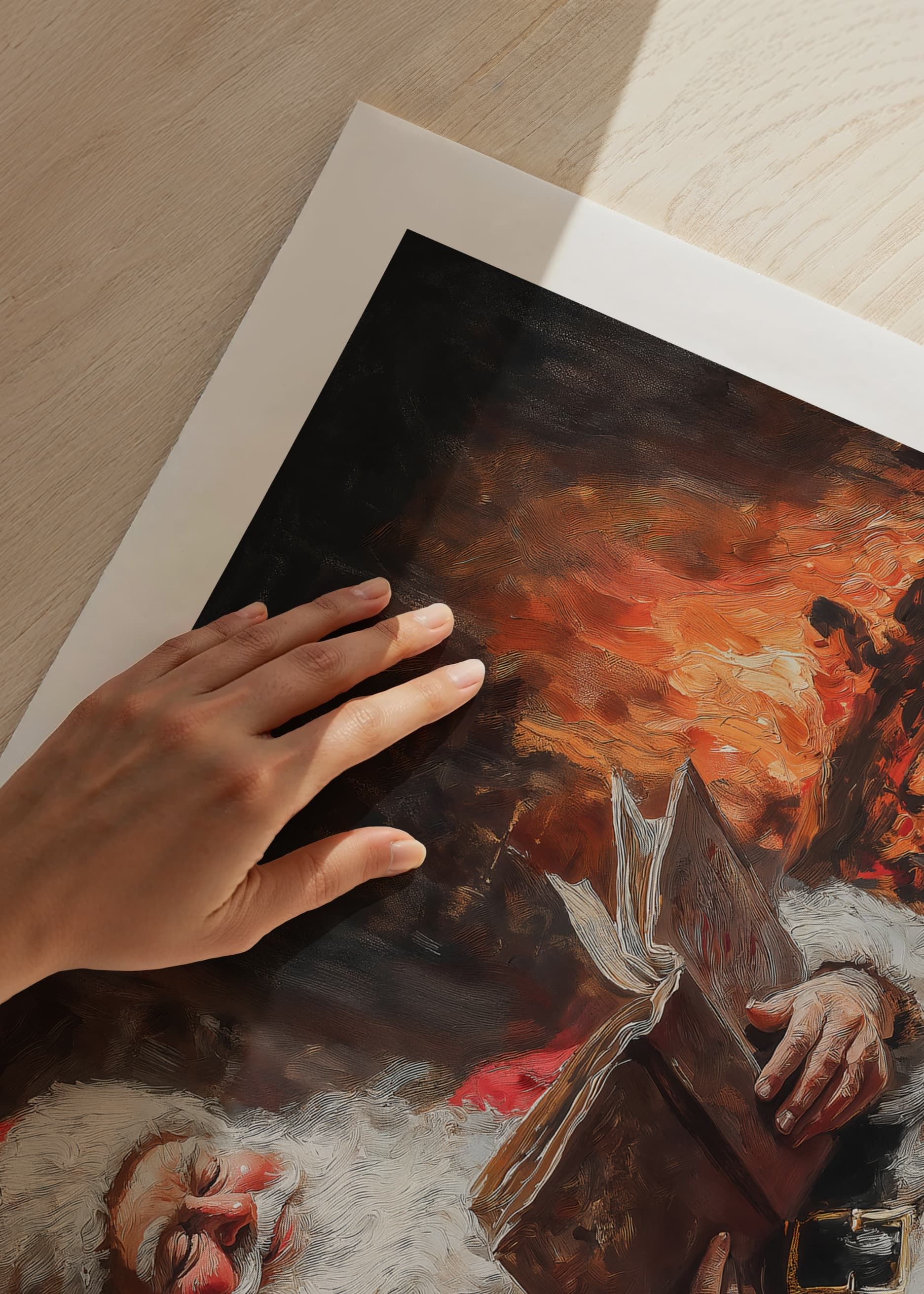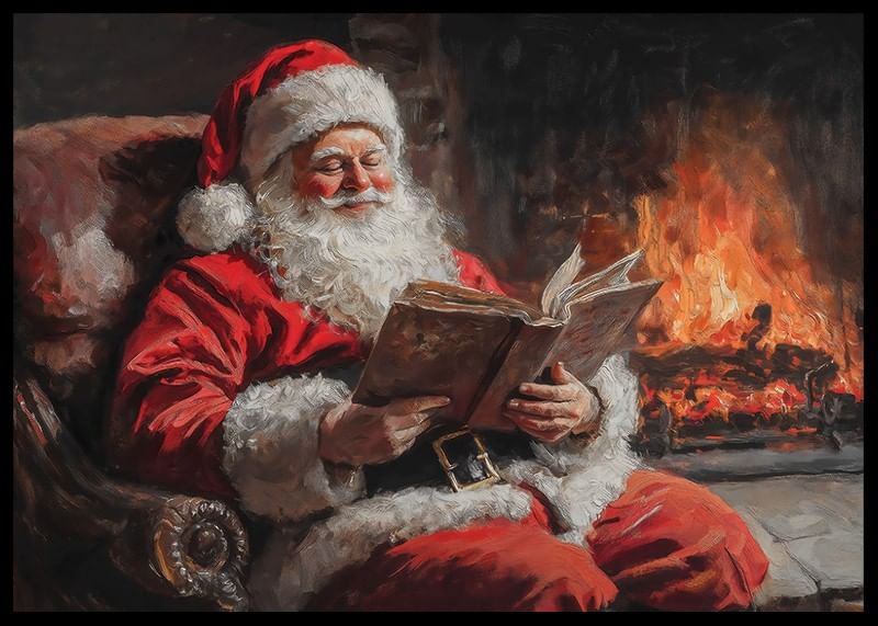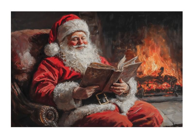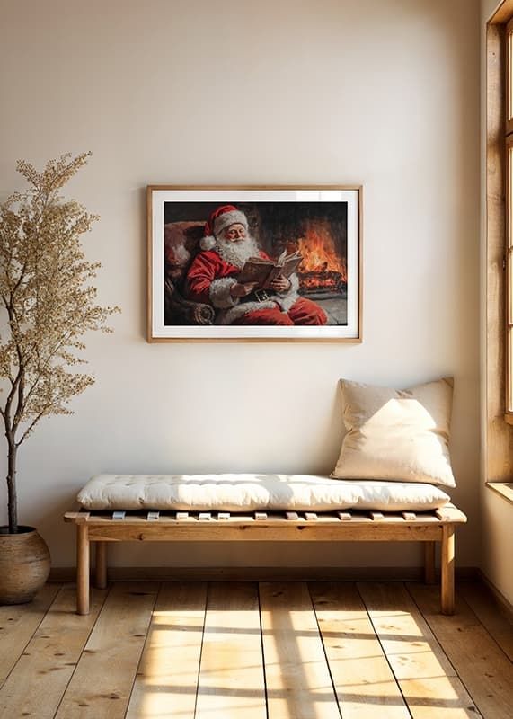 Create a cozy Christmas atmosphere with this lovely poster that shows Santa in a quiet moment by the fire, where he sits comfortably reading a book. The warm glow of the fire and Santa's relaxed expression convey a feeling of security, homeliness and the magical anticipation of Christmas. Perfect for spreading warmth and tradition in your home during the festive season - a picture that captures the very best moments of Christmas