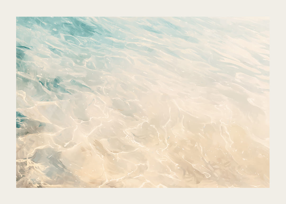 This harmonious poster captures the gentle movement of the crystal clear water as the sun's rays reflect on the light sandy bottom. The shifting blue and golden tones create a sense of calm, freedom and a holiday feeling all year round.