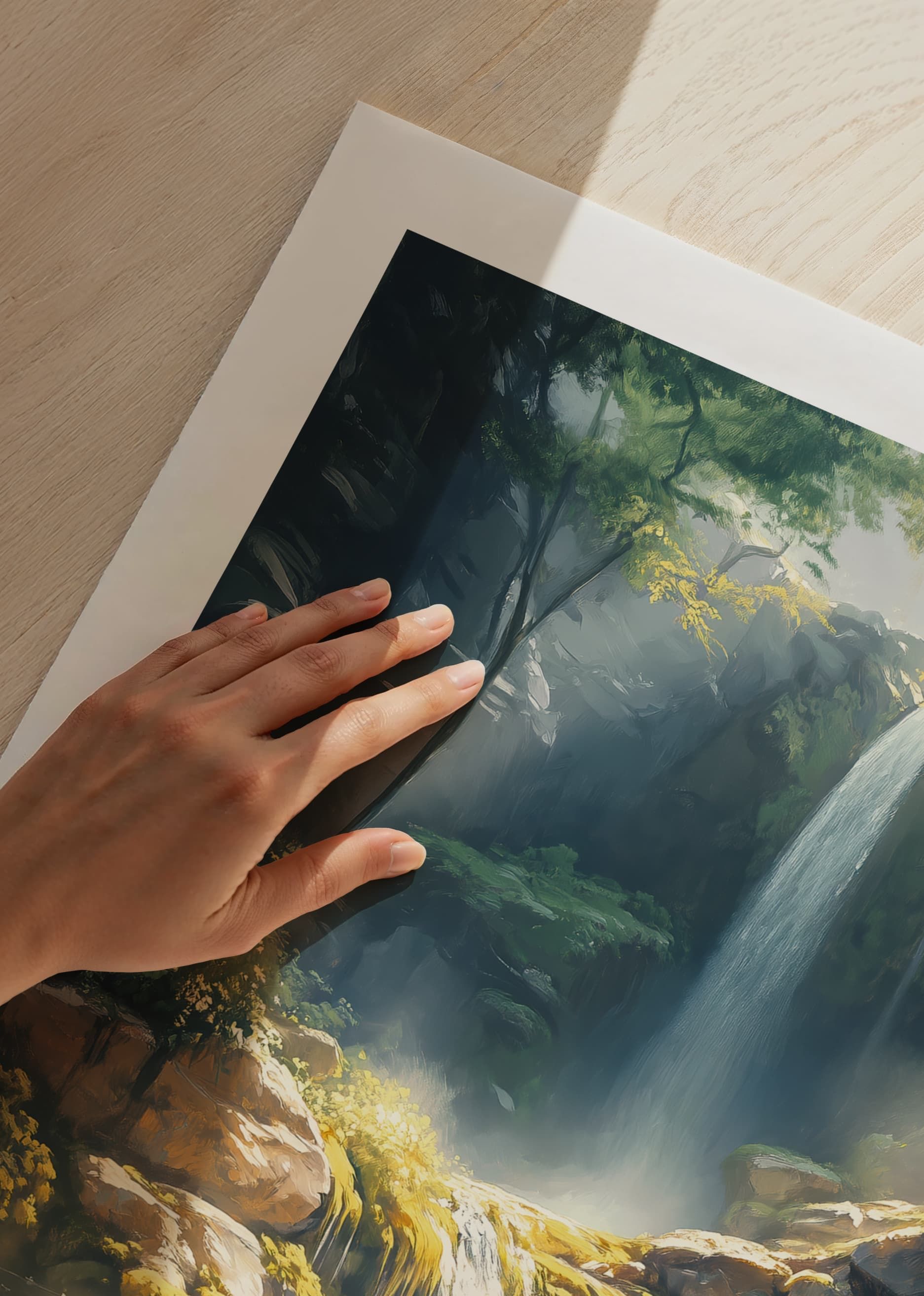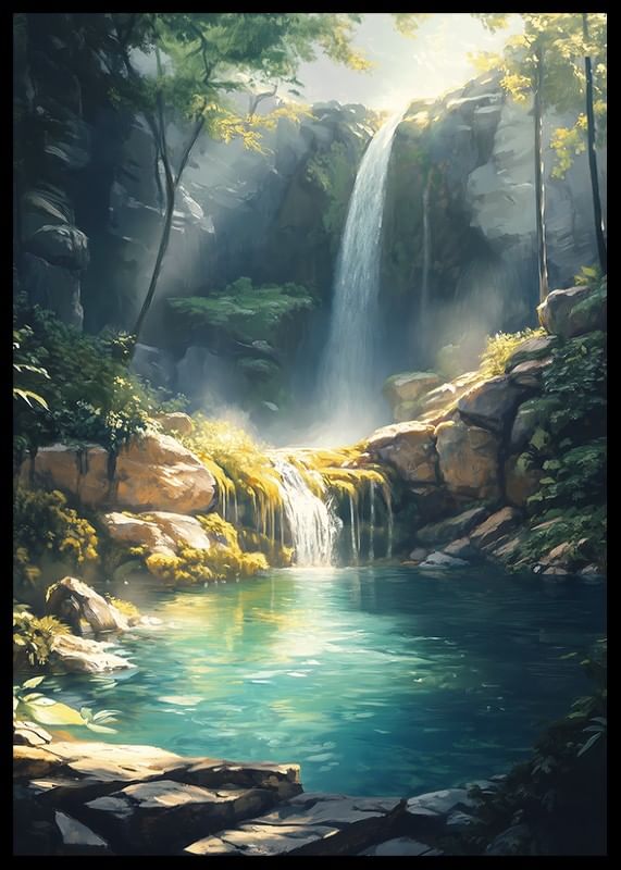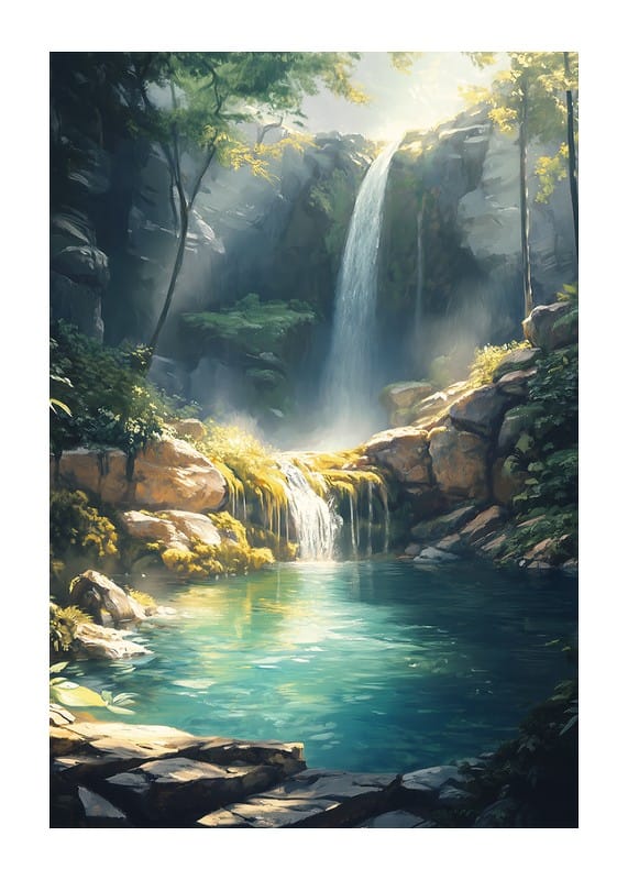 This atmospheric poster captures a fairytale waterfall oasis, where crystal clear water cascades into a turquoise lagoon, surrounded by lush greenery and sunlit cliffs. The light filtering through the treetops creates a harmonious and peaceful atmosphere.