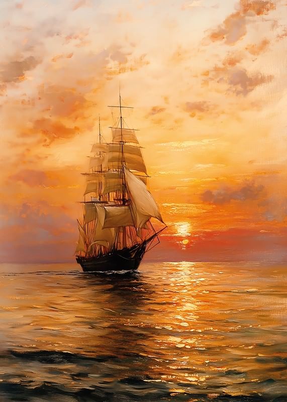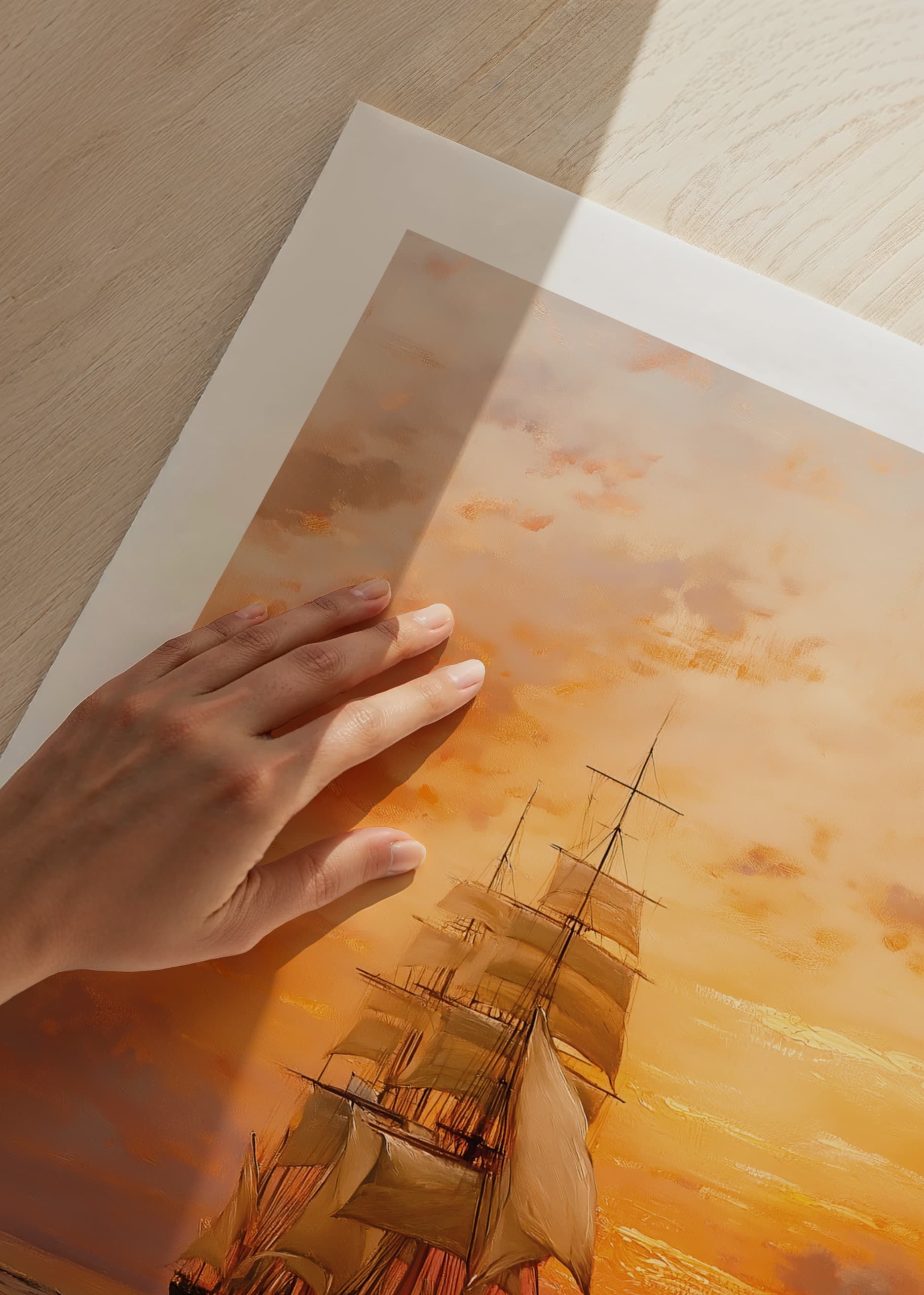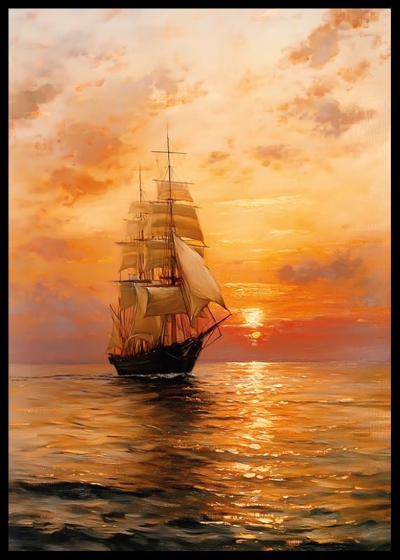 This magnificent poster captures a majestic sailing ship gliding across the sparkling sea in the warm glow of sunset. The full sails sway in the wind while the fiery hues of the sky are reflected in the water.