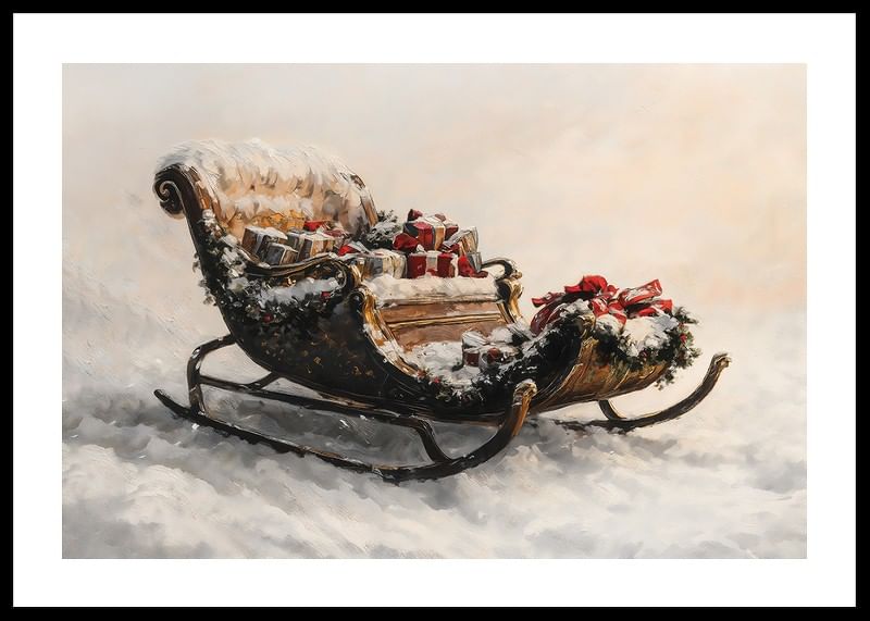 Spread the magic of Christmas in your home with this elegant poster depicting a beautifully decorated sleigh, filled with wrapped packages and covered in a light blanket of snow. With its classic details and adorned with green spruce and red ribbons, the image captures the joy and anticipation of the holiday season. Perfect for creating a warm and festive atmosphere, this poster conveys the tradition and enchantment of Christmas at its best.