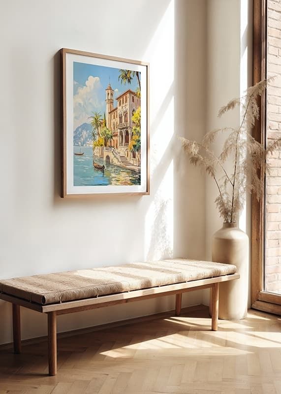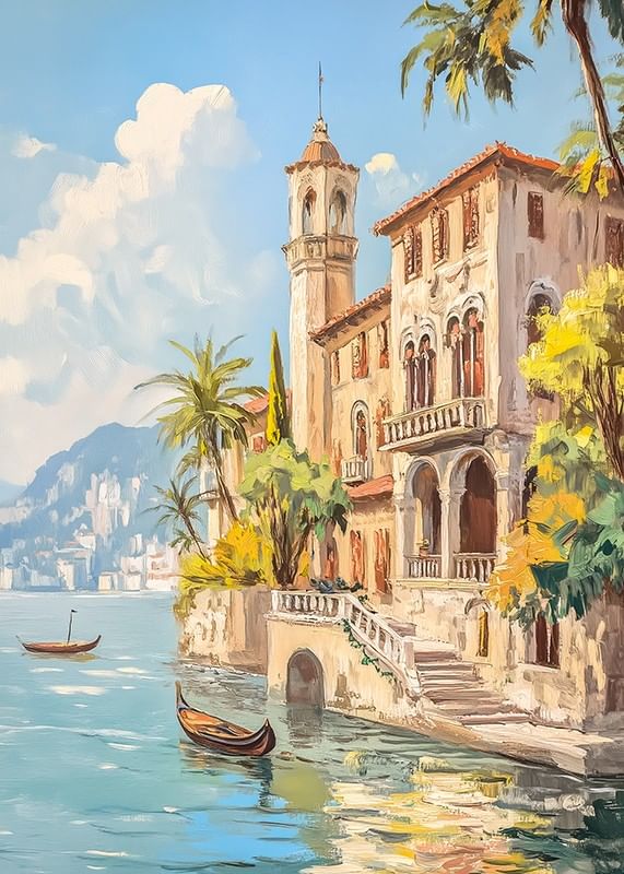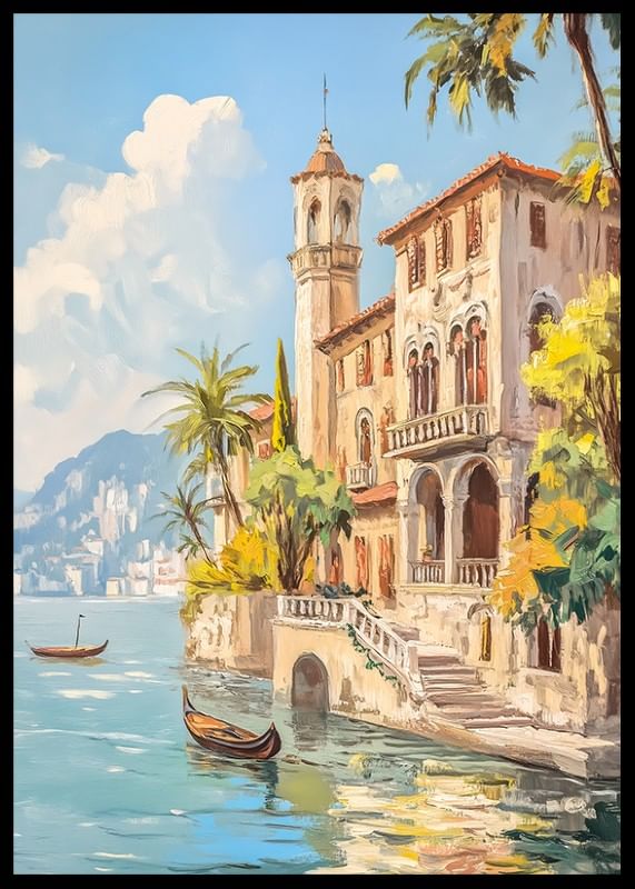 This poster captures the essence of Mediterranean romance with a sun-kissed villa on the sparkling water. Palm-lined steps lead down to a picturesque quay where gondolas rest in the calm breeze. The warm tones and idyllic landscape create a sense of relaxation and luxury.