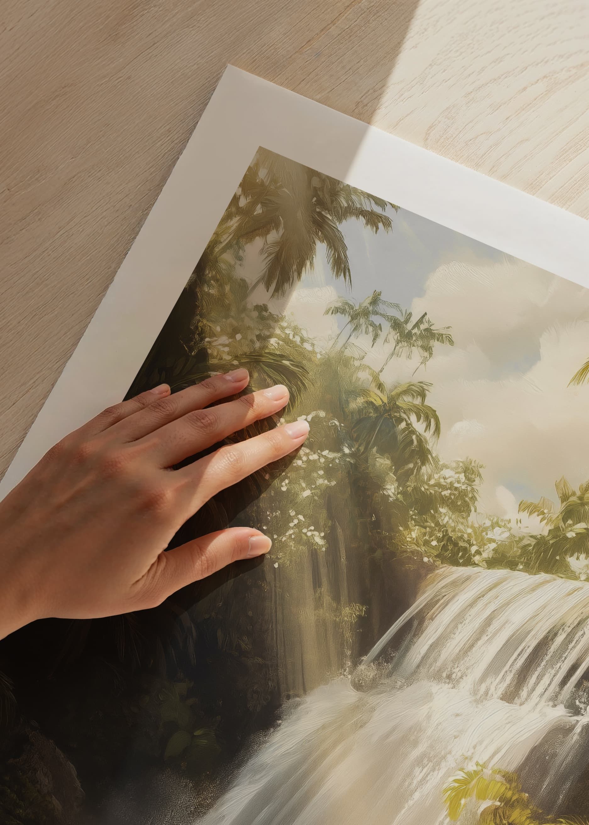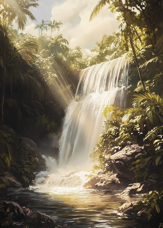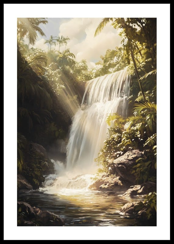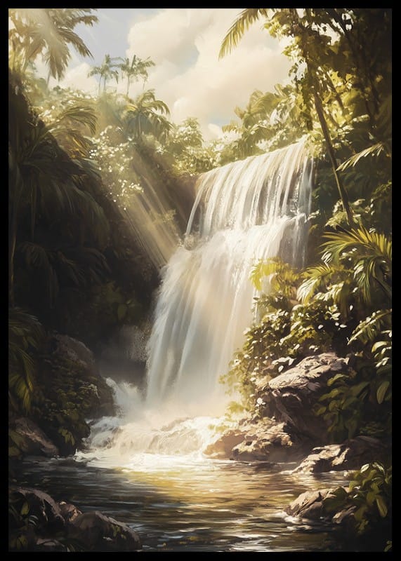 Experience the magic of nature with this poster that captures a majestic waterfall, surrounded by lush greenery and golden rays of sunshine. The water cascades down into a tranquil lagoon, where the light creates a dreamy and peaceful atmosphere.