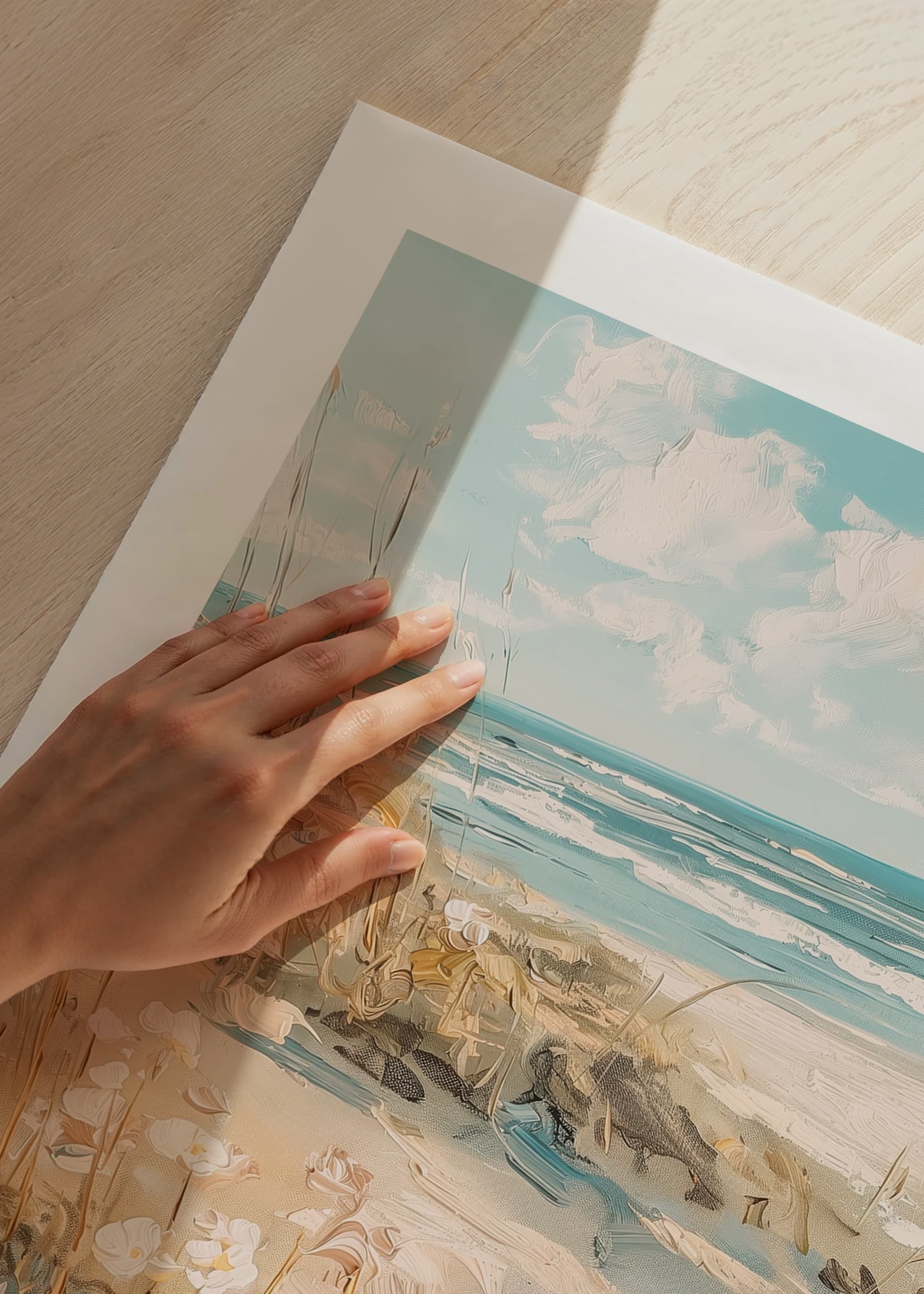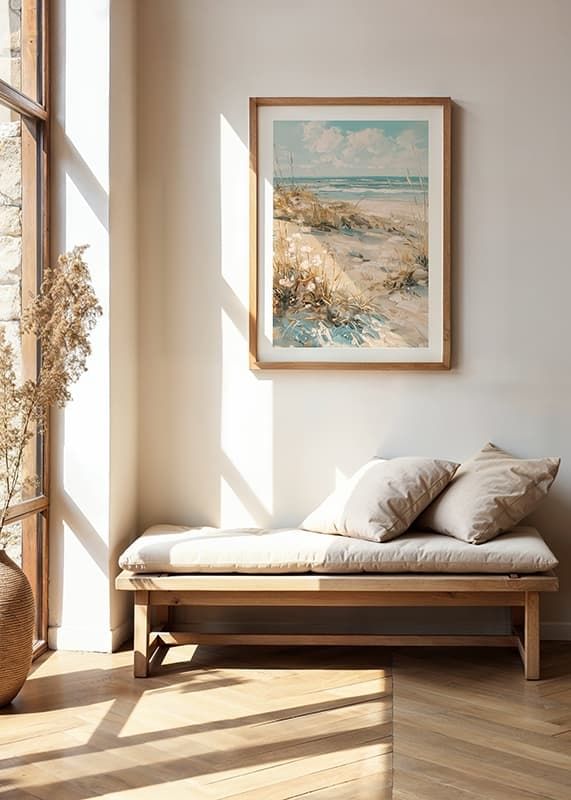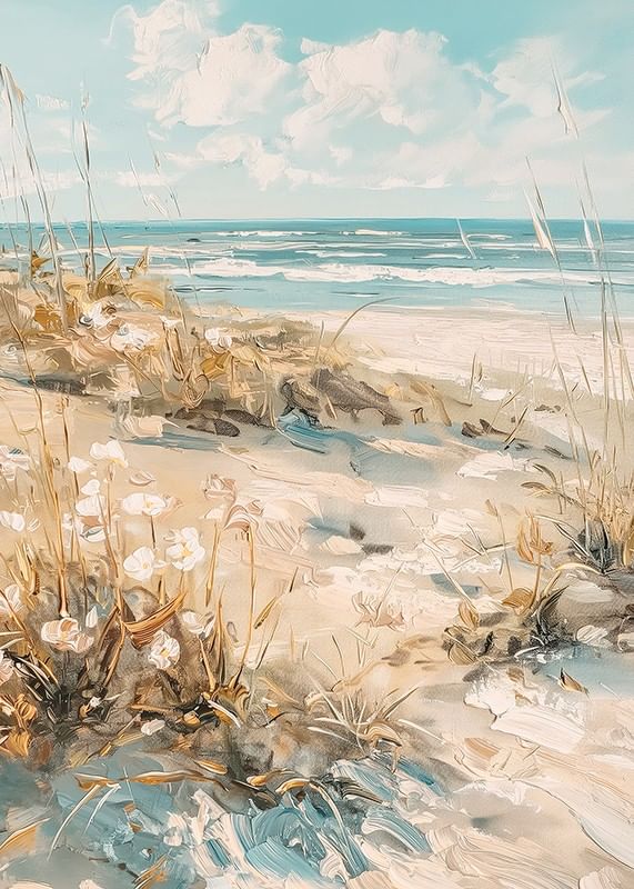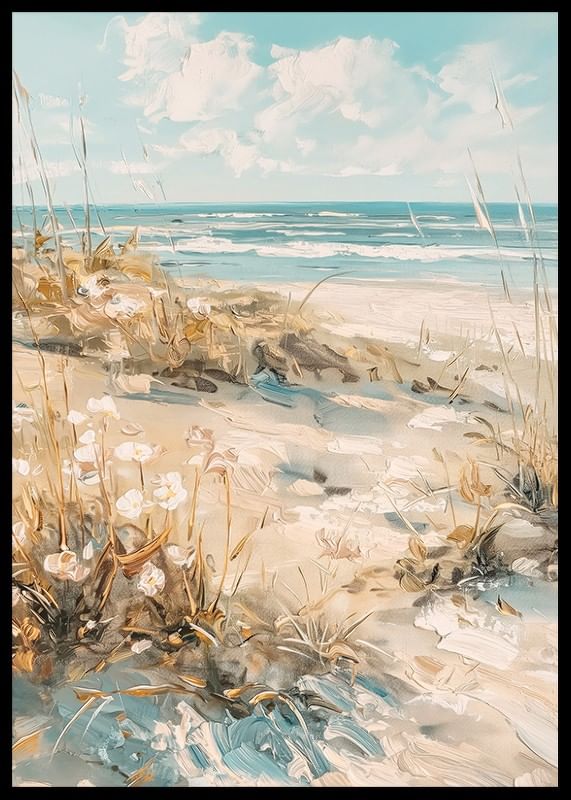 Bring a sense of calm and harmony to your home with this beautiful poster of a sunny beach with soft sand dunes, wildflowers and a sparkling sea in the background. The soft brushstrokes and warm, natural colors create a dreamy atmosphere that brings to mind lazy summer days by the coast.