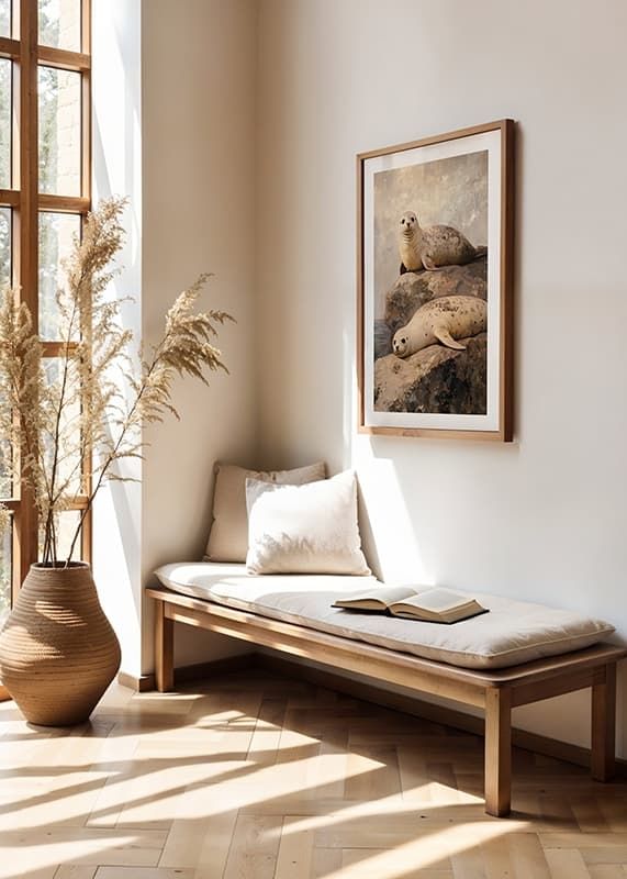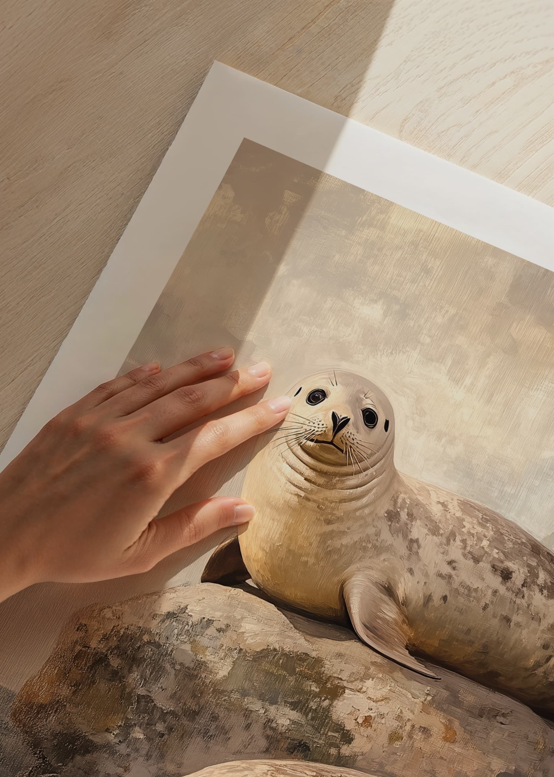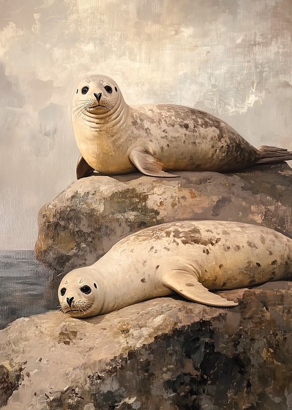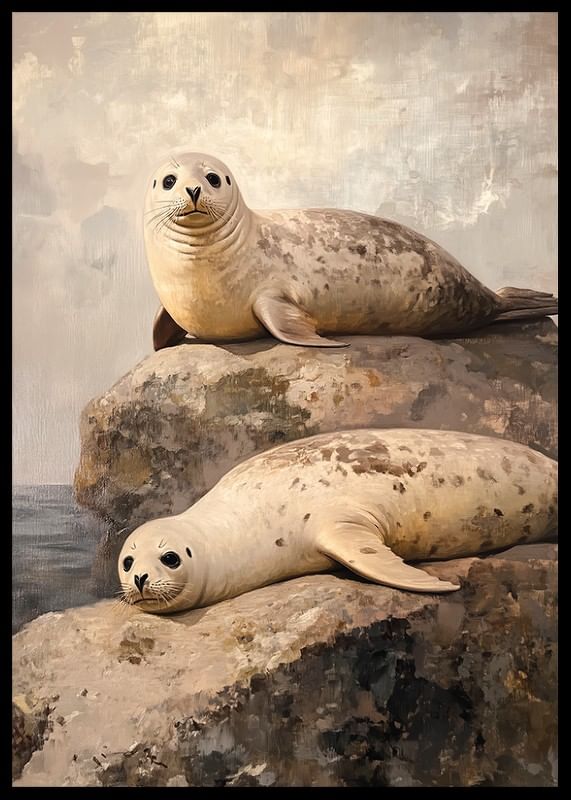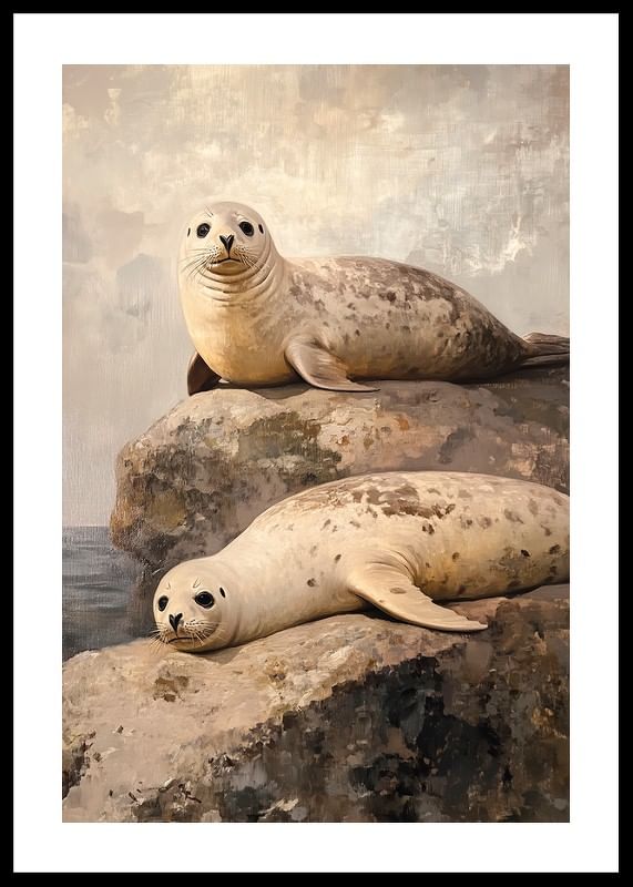 Create a warm and harmonious feeling in your home with this charming poster of two seals resting on rocks by the sea. The soft tones and detailed brushstrokes capture the animals' calm and curious expressions, while the coastal setting creates a calming atmosphere.