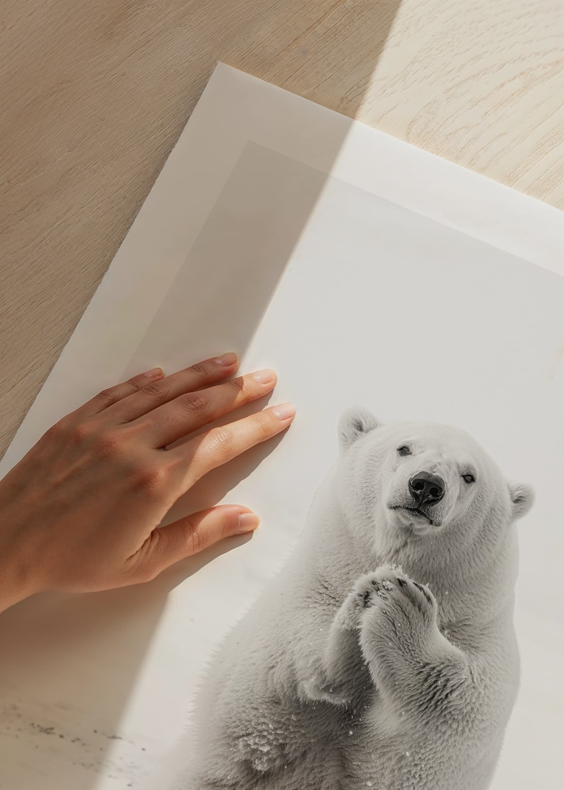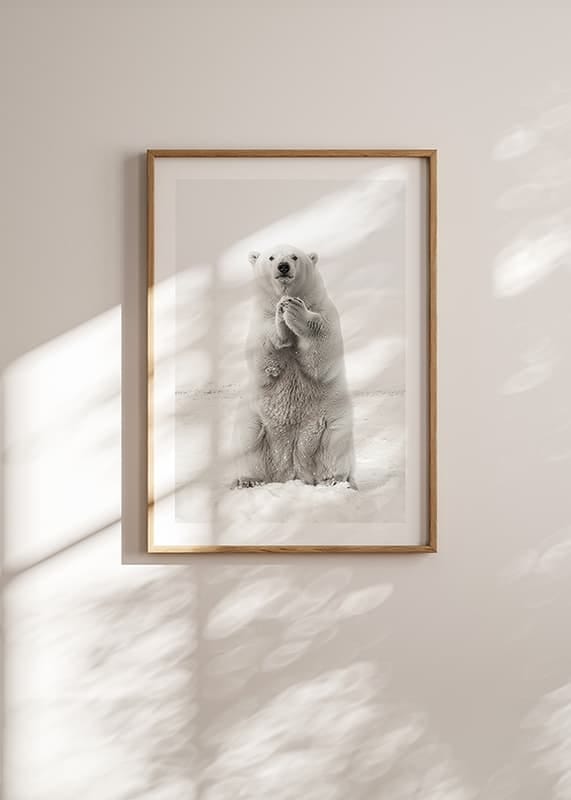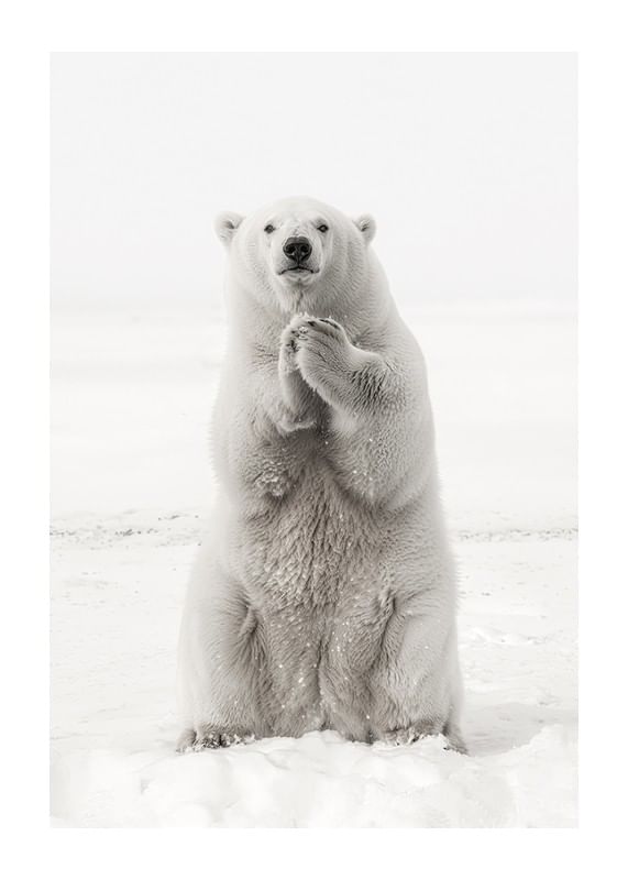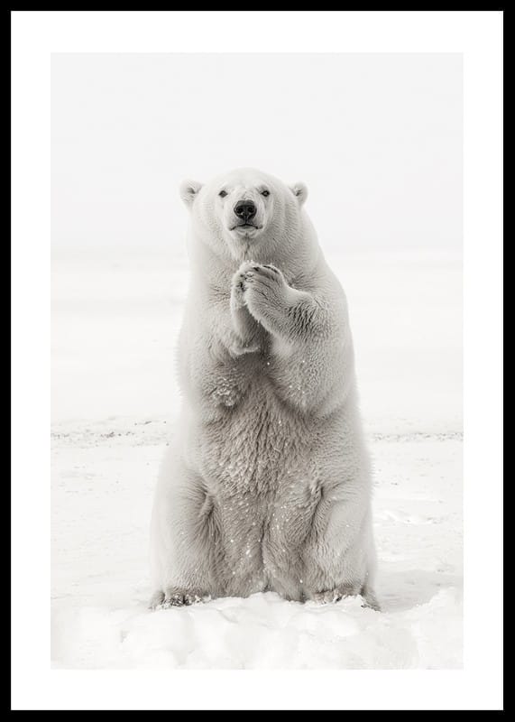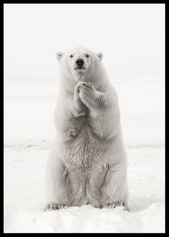 Experience the beauty and power of the Arctic with this impressive poster. The image shows a majestic polar bear standing upright in the snow-covered landscape, a symbol of strength and charm in one of the world's most remote environments. Perfect for those who want to surround themselves with the peaceful presence of the arctic wilderness. A tribute to the guardians of the northern wilderness and nature's amazing survivors.