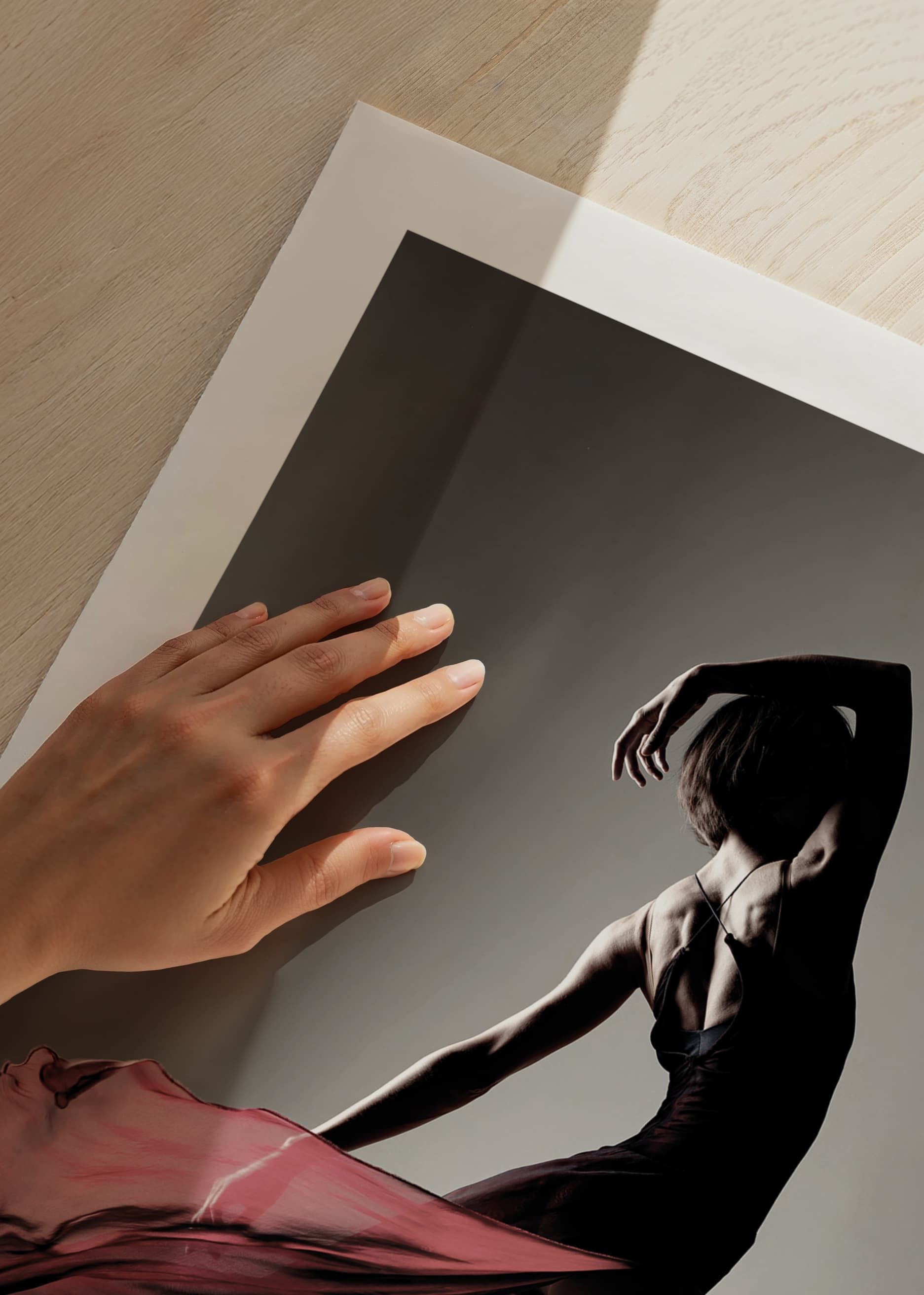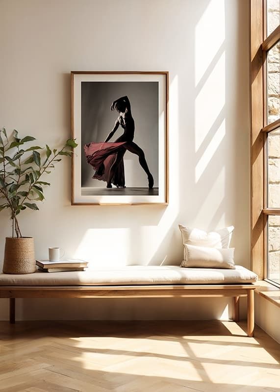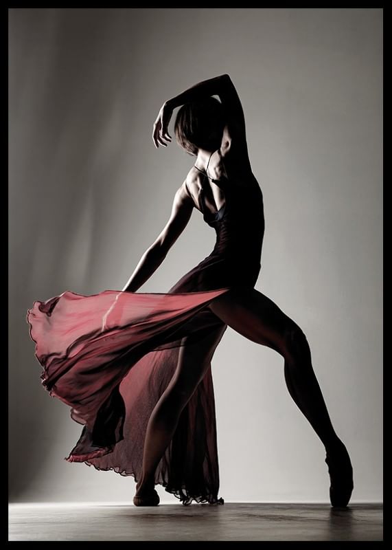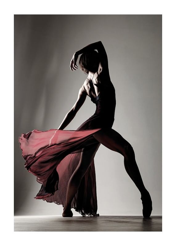 Capture the power and beauty of dance with this elegant poster that highlights a dancer's movement in complete harmony. The silhouette expresses both strength and graceful lightness, while the flowing fabric of the dress gives a sense of movement and passion. Perfect for creating a sense of artistic inspiration in your home, where the language of the body tells about feeling, rhythm and expression.