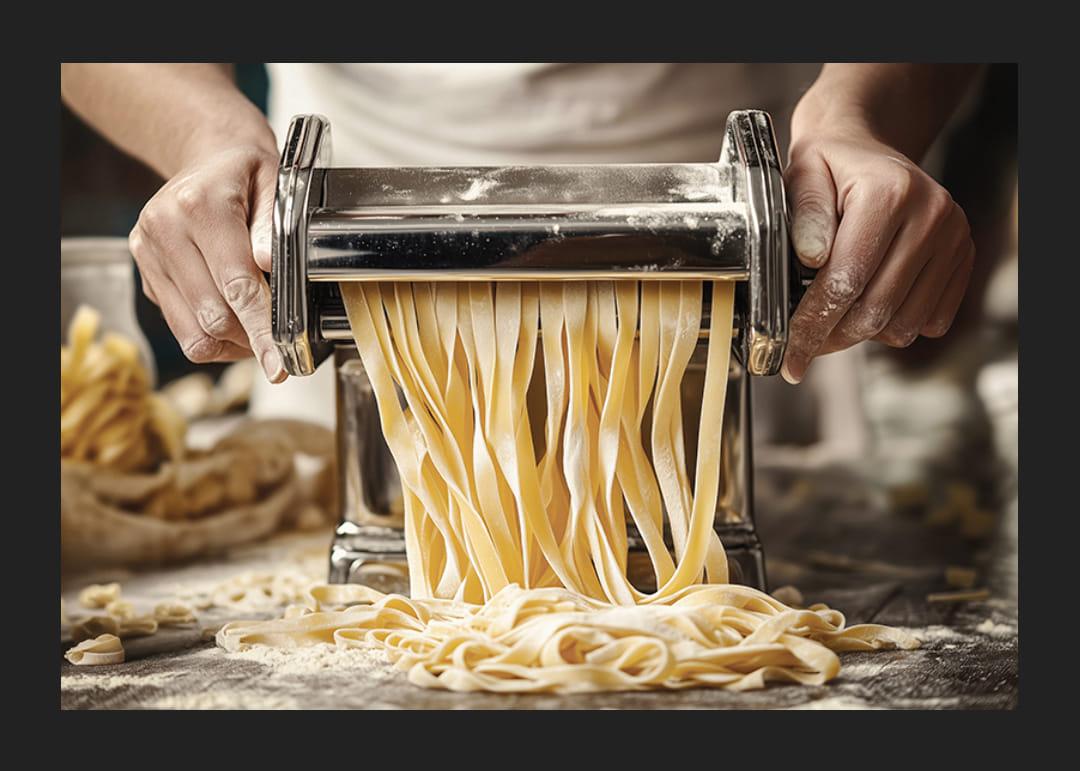 Capture the essence of Italian food art with this inspiring poster. The image shows hands carefully cranking out fresh pasta, straight from the machine and ready to be transformed into a taste experience. Perfect for the kitchen or dining area, this poster conveys the sense of craftsmanship, tradition and love for genuine cuisine. A reminder that the best flavors often start with the simplest of ingredients.