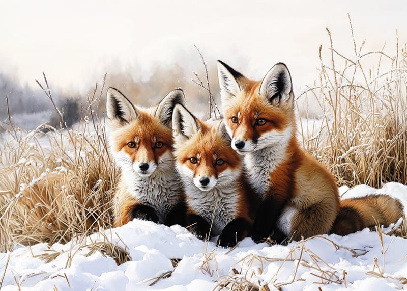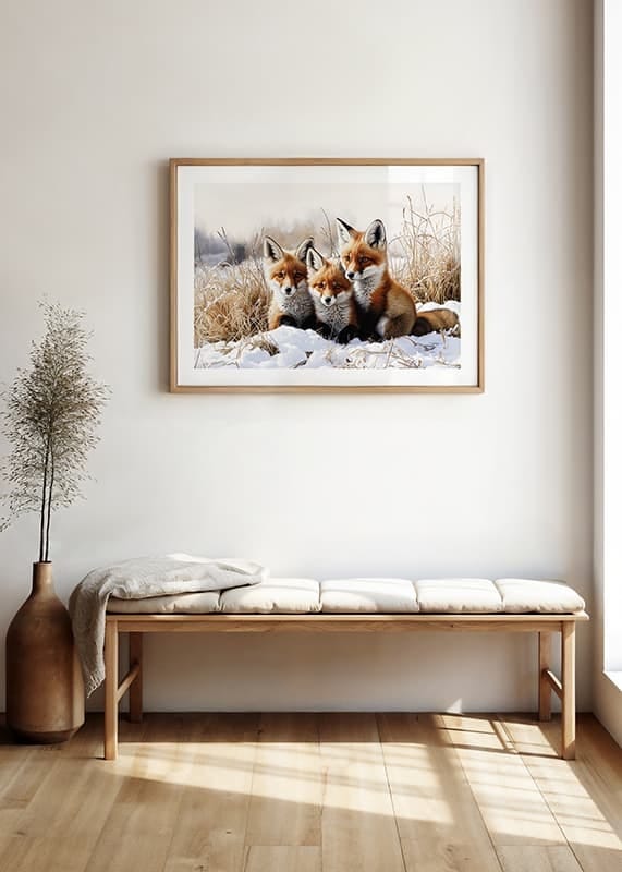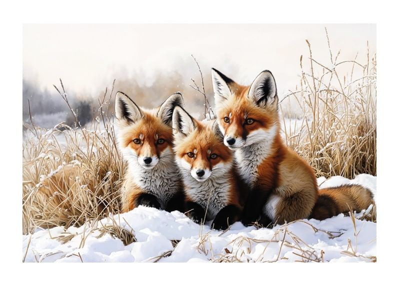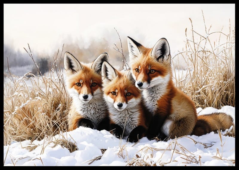 This poster captures the charm of nature with three foxes sitting together in a snowy landscape, surrounded by winter grass and soft daylight. Their curious gazes and dense coats give a feeling of both warmth and wildness, perfect for creating an atmospheric atmosphere in the home. Let this image remind you of the beauty of winter and the magic of nature - a timeless decoration for anyone who appreciates wildlife and the peaceful charm of winter.