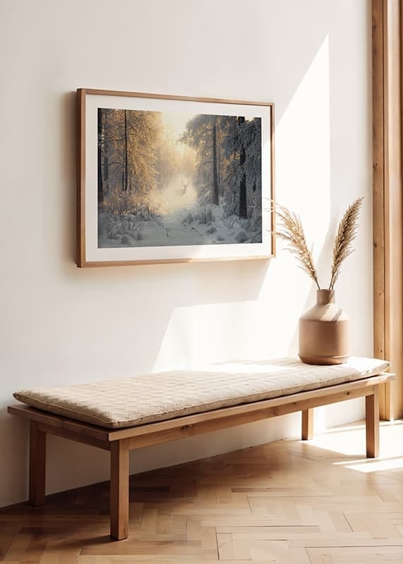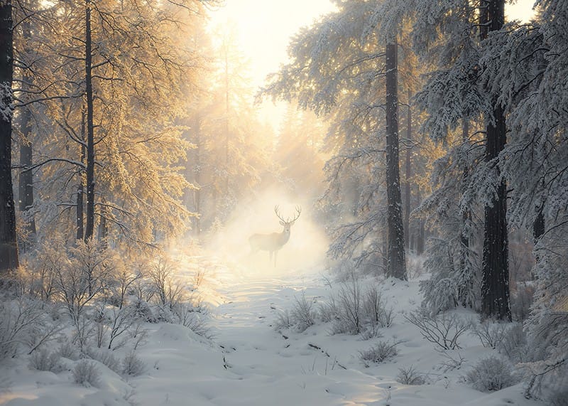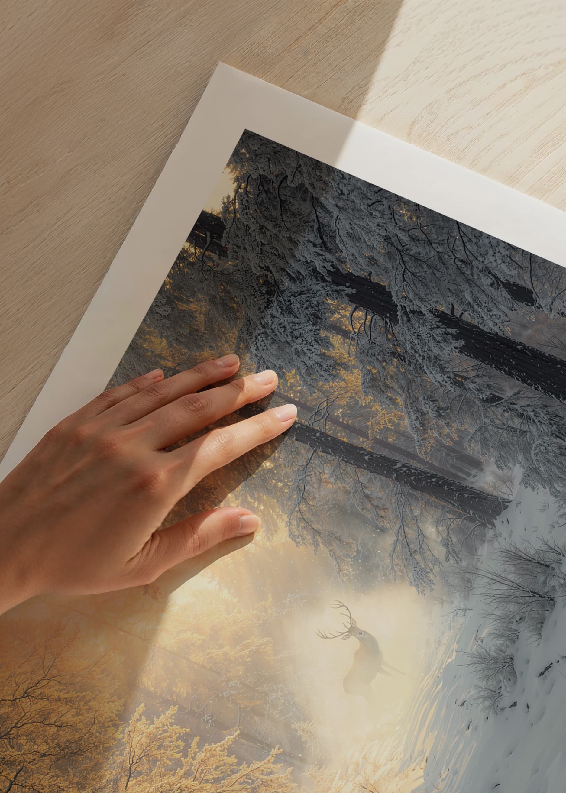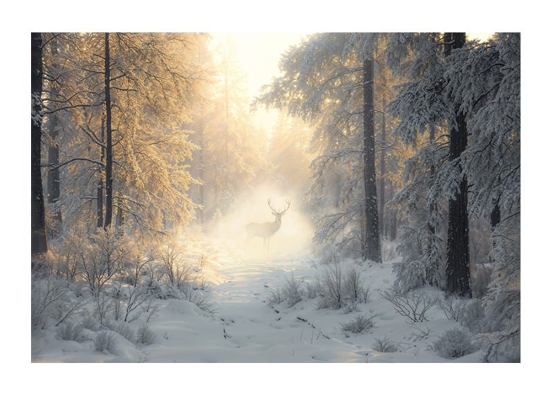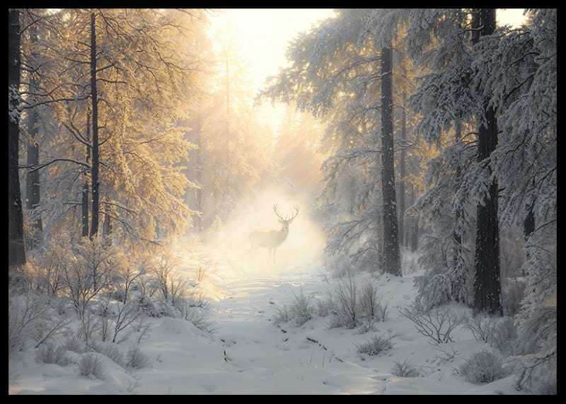 This poster captures a magical winter morning in the forest, where a majestic deer stands surrounded by sparkling snow and golden rays of light breaking through the trees. The picture radiates calm and mystery, perfect for creating a harmonious atmosphere in the home. Let this scene remind you of the stillness of winter and the majestic beauty of the forest - a timeless decoration for all who are fascinated by the enchanting charm of nature.