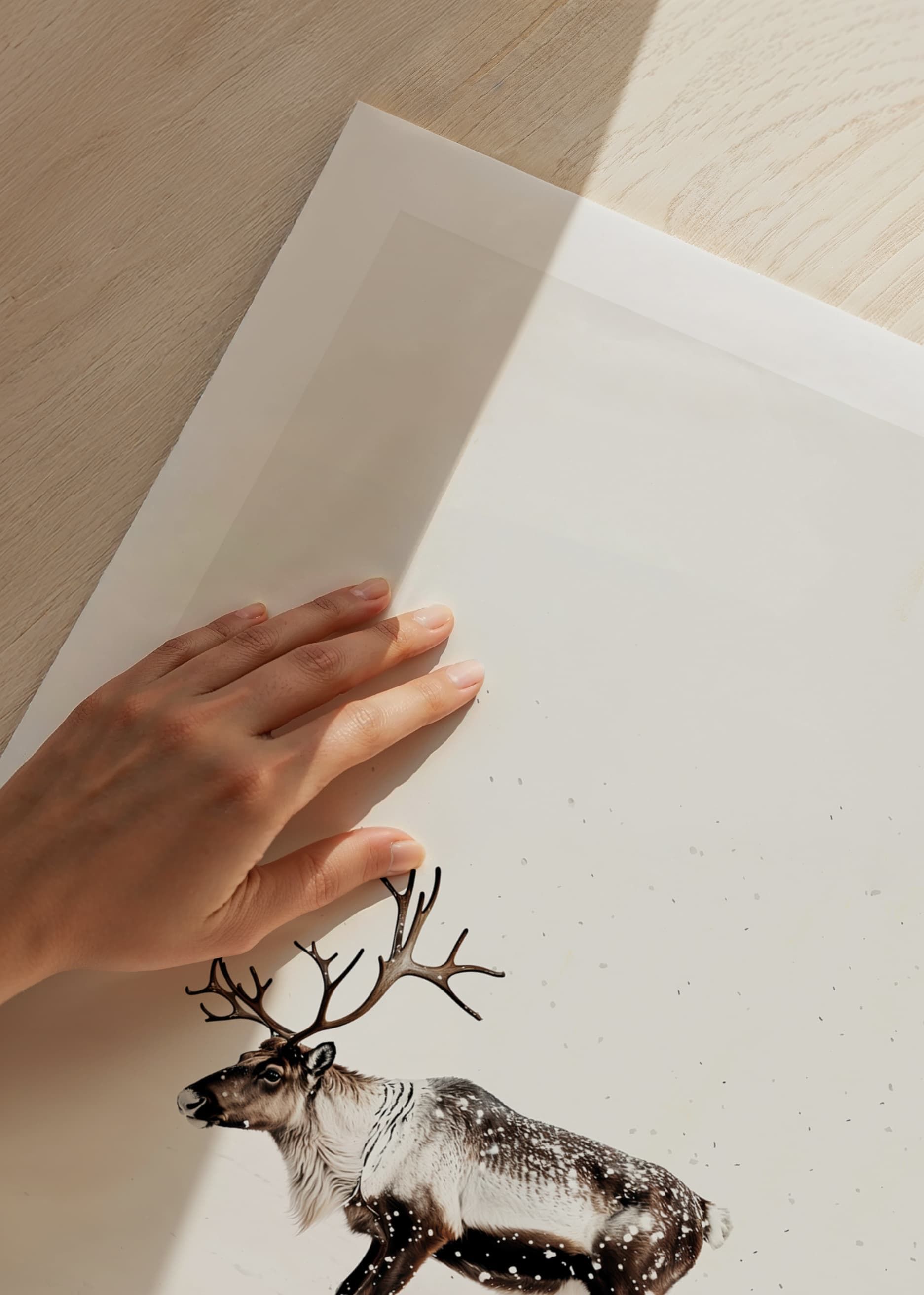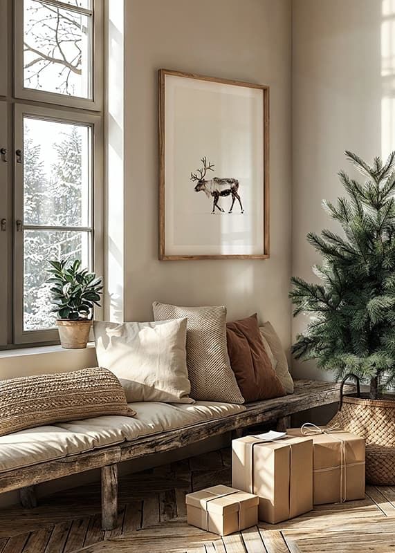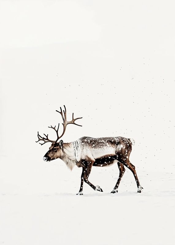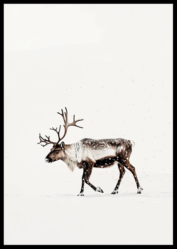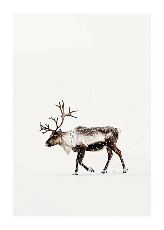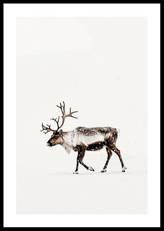 This poster captures the magic of Nordic winter with a lone reindeer wandering through a snow-covered landscape. With its majestic antlers and the still snow falling around it, the reindeer radiates a sense of tranquility and the beauty of the wilderness. Perfect for creating a harmonious and natural atmosphere in the home, this image becomes a reminder of the quiet charm of winter and the timeless elegance of the Nordic landscape.