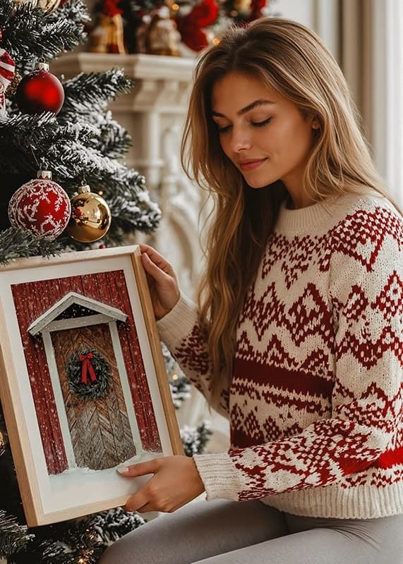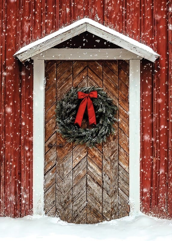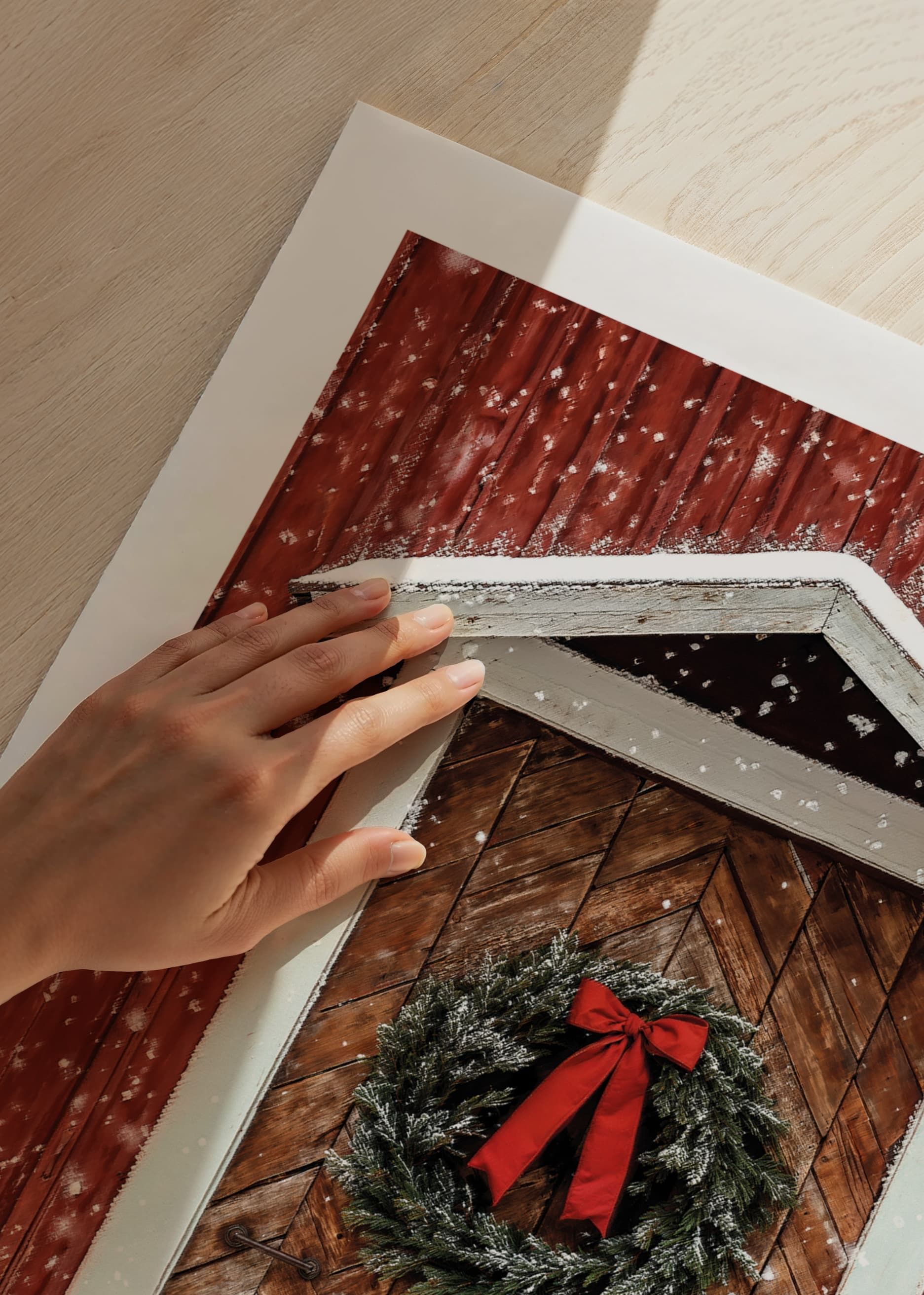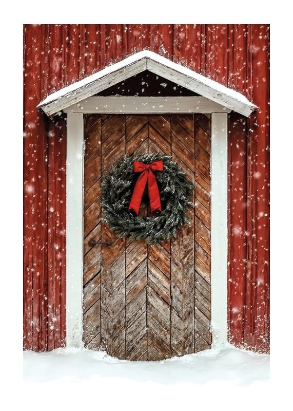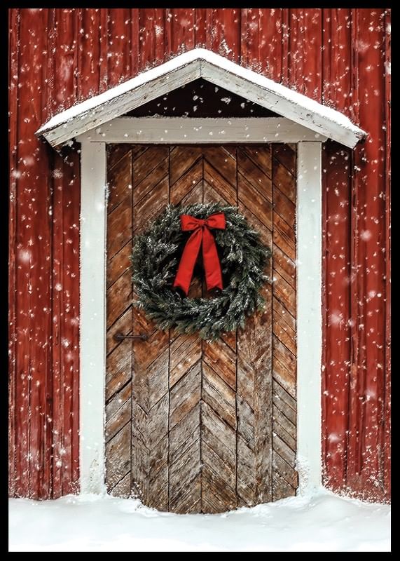 This poster captures the rustic Christmas spirit with a traditional green wreath adorned with a red bow on an old wooden door, framed by a snow covered red wooden facade. Snowflakes fall softly and reinforce the feeling of winter and cosiness. Perfect for creating a cozy Christmas feeling in the home, this picture is reminiscent of classic Nordic winters and welcomes Christmas with style and tradition.