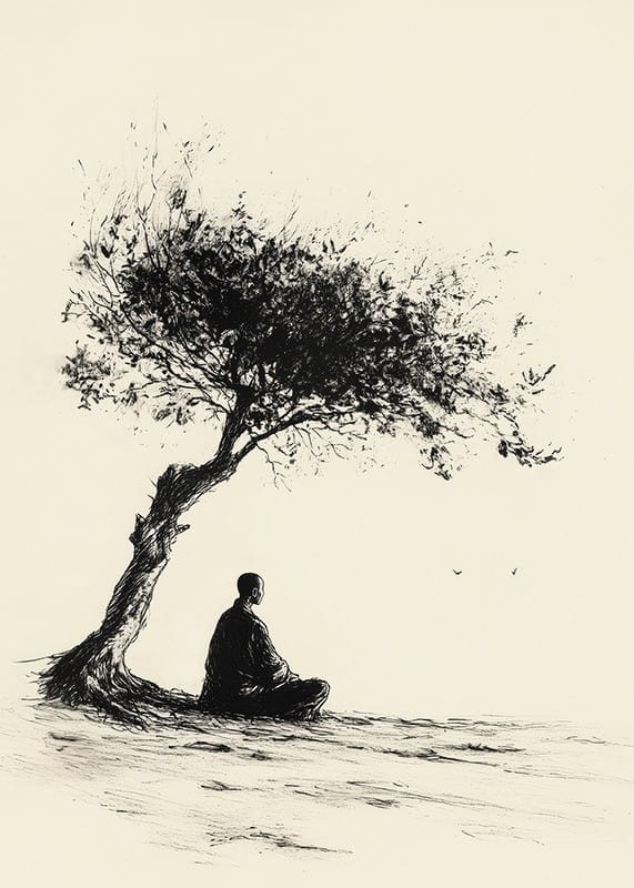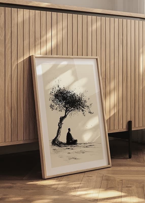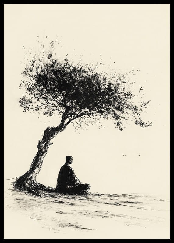 Fill your home with calm and contemplation with this stylish poster that captures a meditative moment under a lonely tree. The minimalist expression and strong contrasts create a sense of balance and harmony, perfect for inspiring mindfulness and tranquility.