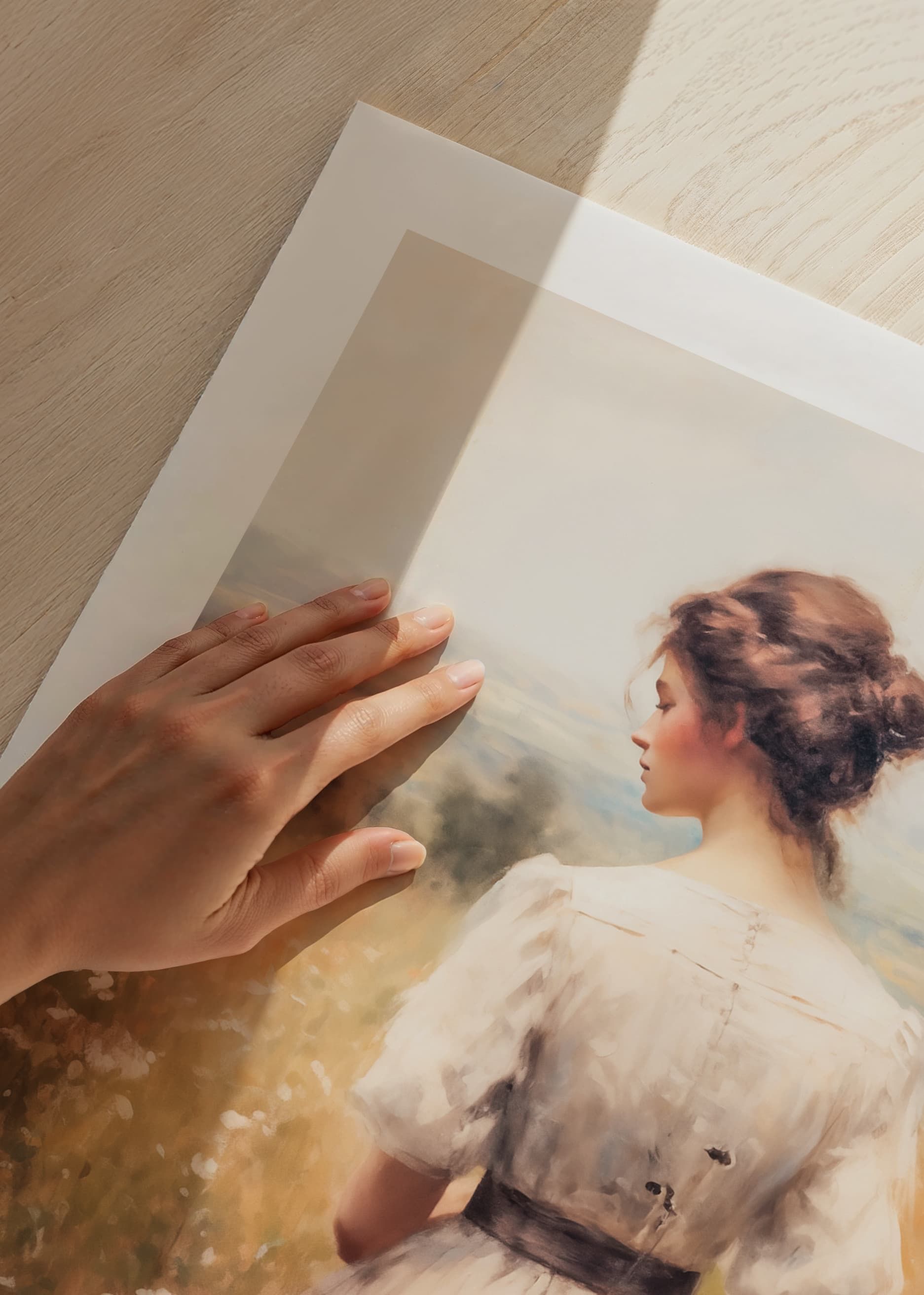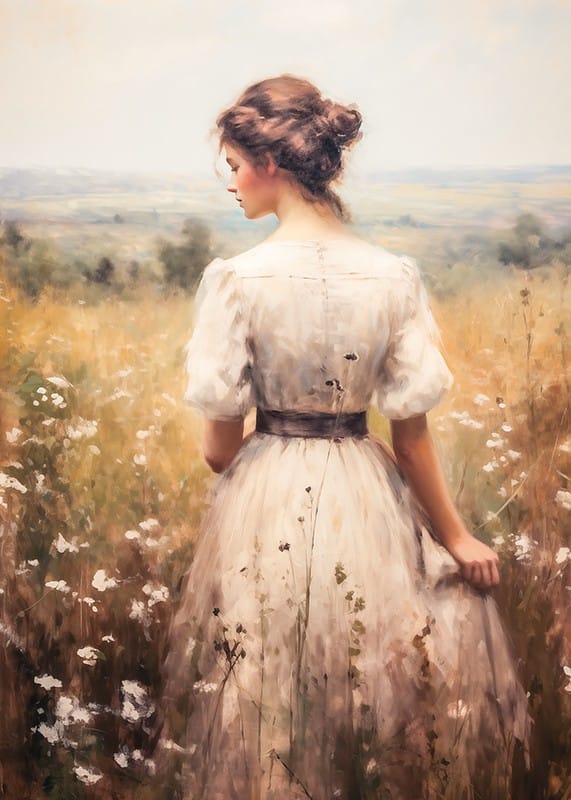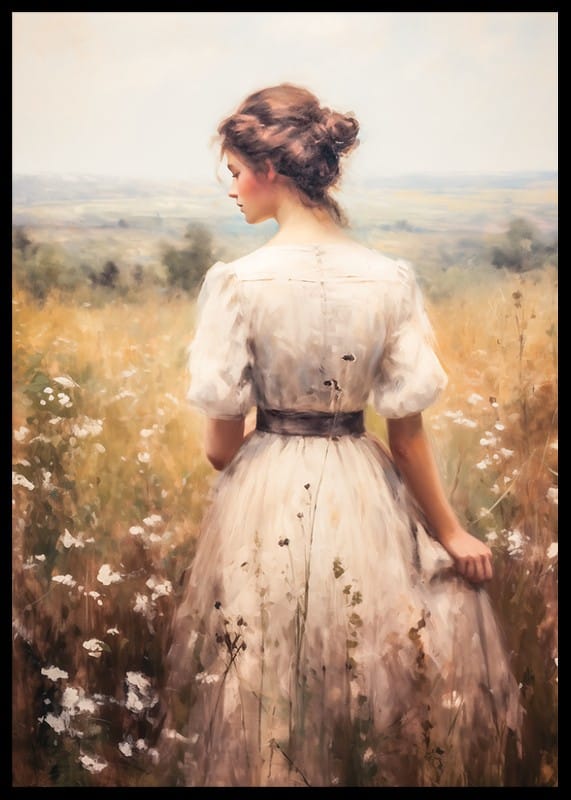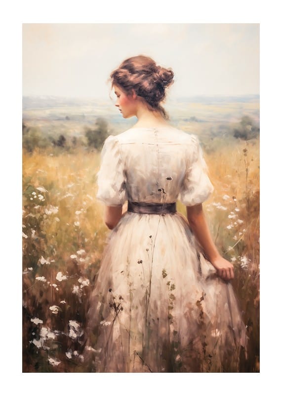 Capture the essence of timeless beauty with this poster depicting a young woman in a softly draped dress, surrounded by sun-kissed meadow flowers and expansive landscapes. With romantic details and a nostalgic feeling for the simplicity of nature, this work of art creates a calming atmosphere and becomes a perfect detail in your home to add warmth and charm to the room