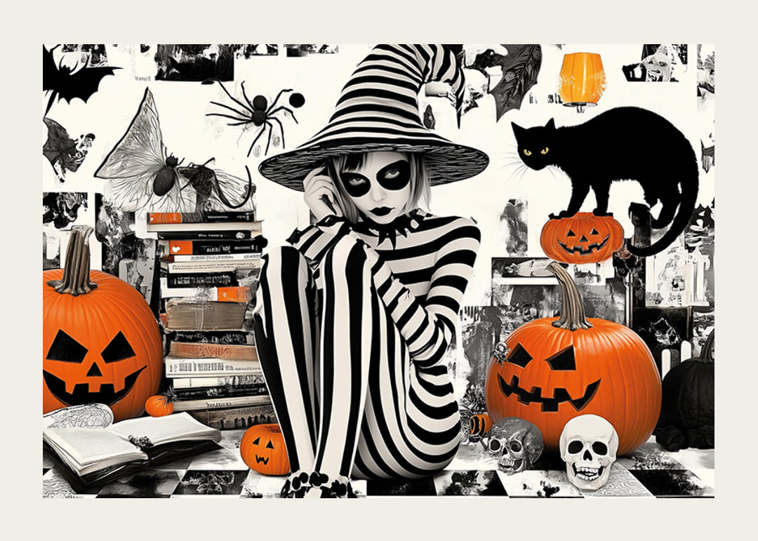 The poster captures an enchanting Halloween atmosphere with its sharp black and white contrasts and bold orange details. A mysterious figure in striped clothing is surrounded by pumpkins and a watchful black cat.