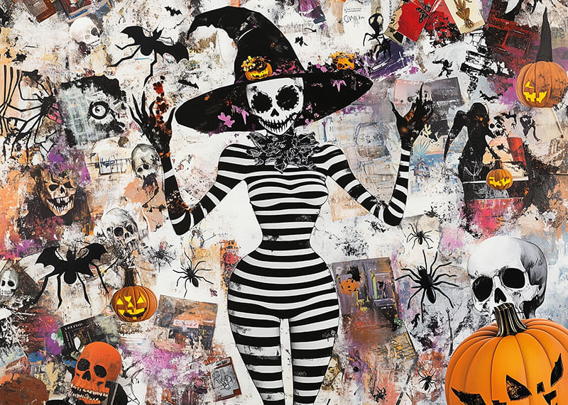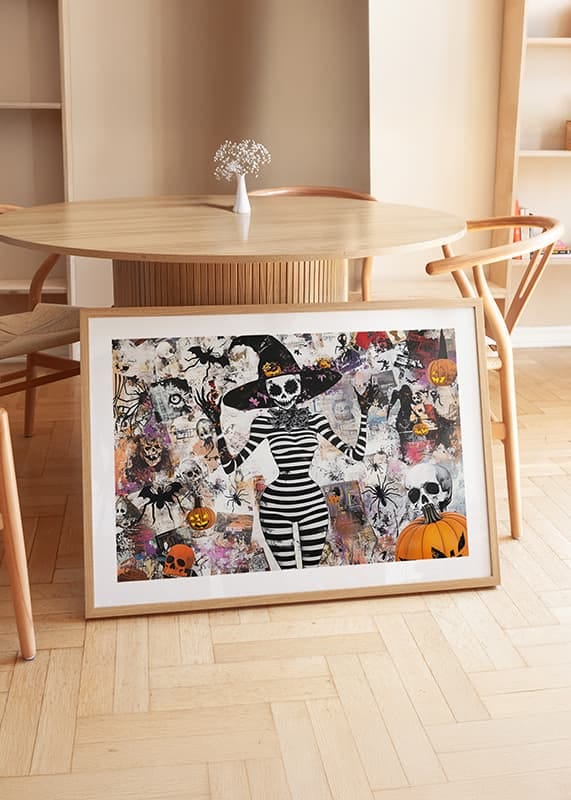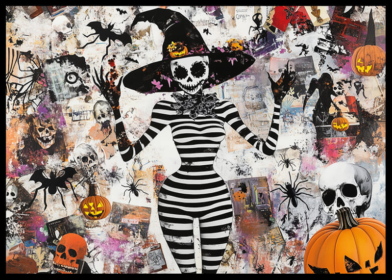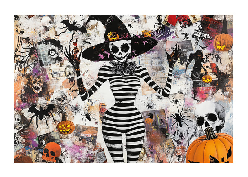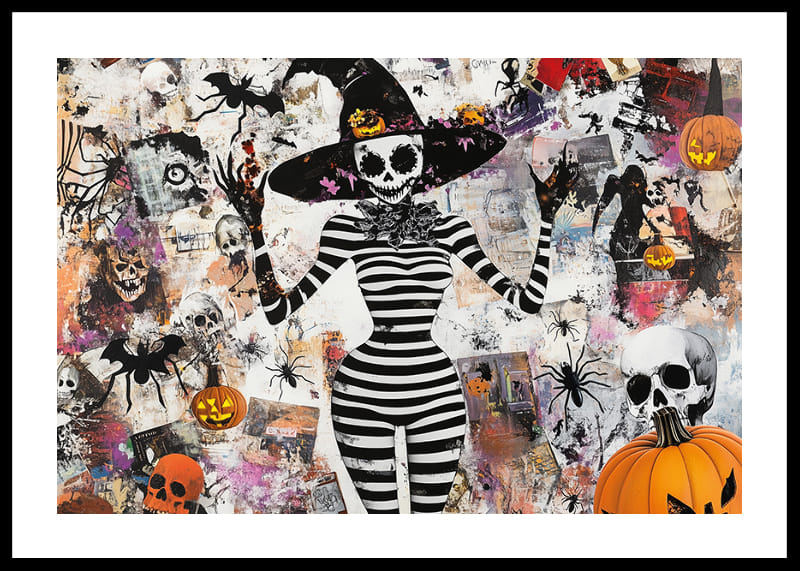This poster captures the magic of Halloween with its playful and mysterious design. The black and white skeleton figure, surrounded by pumpkins and spiders, creates a captivating atmosphere filled with fantasy and a little bit of horror.