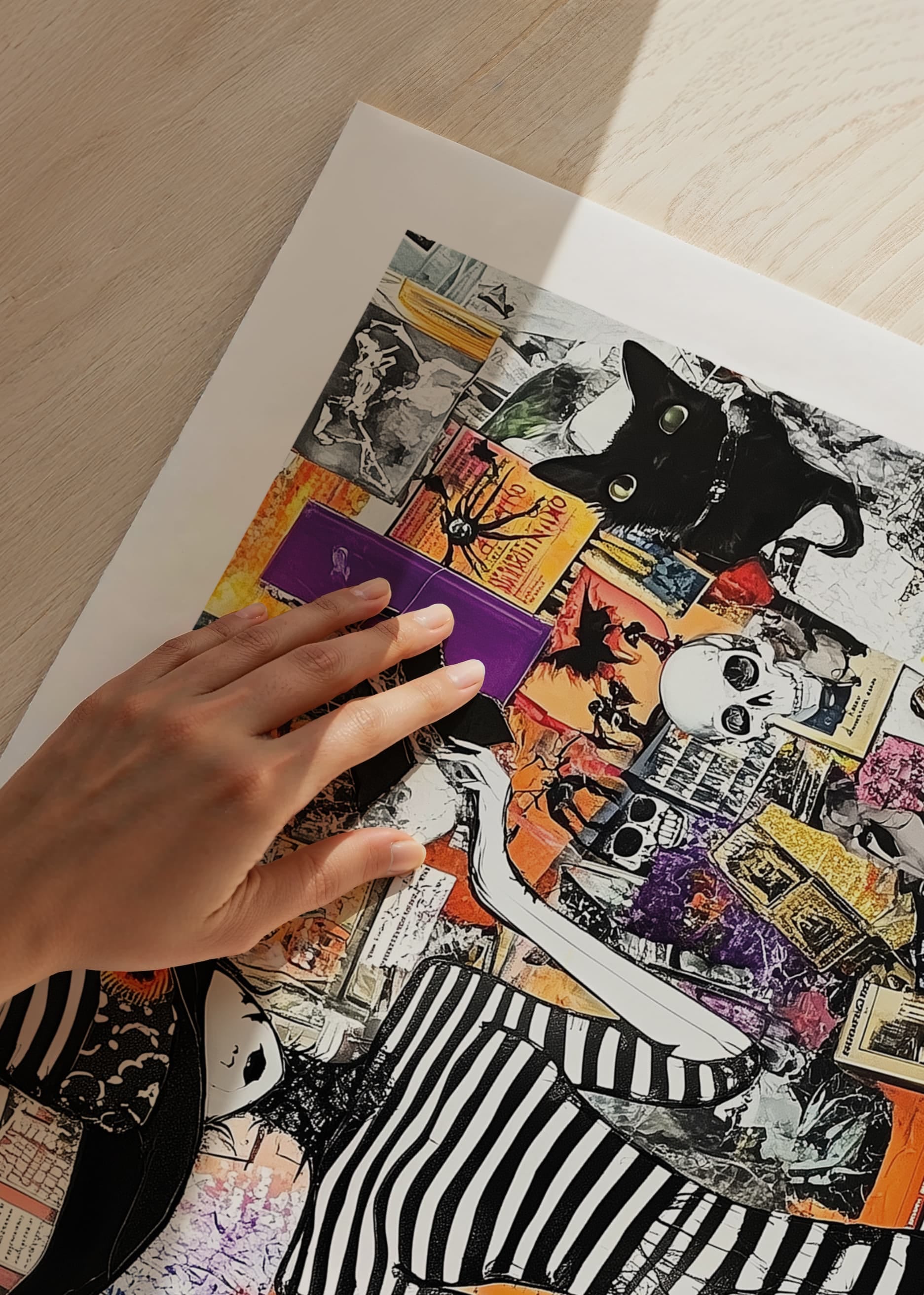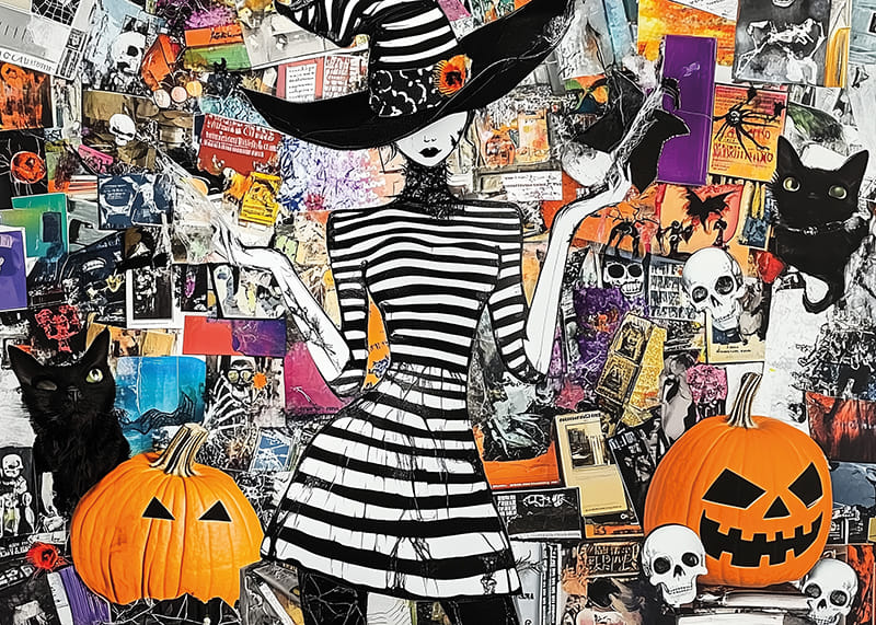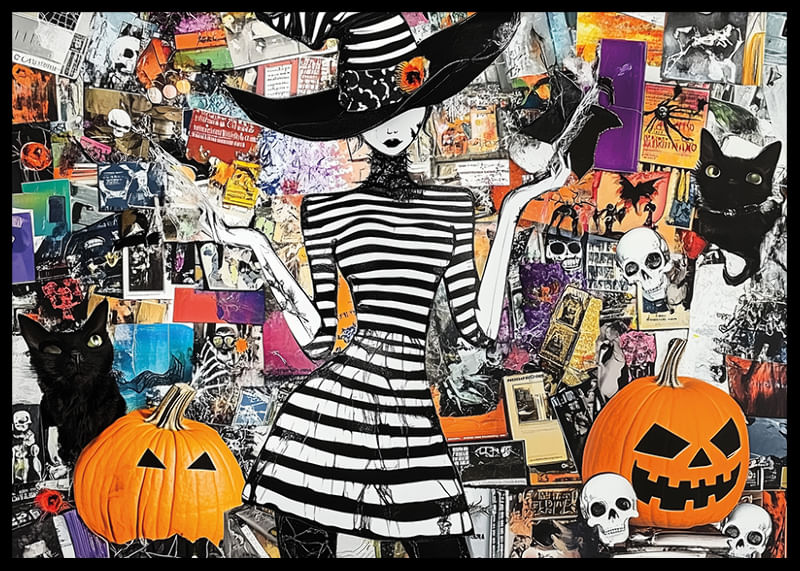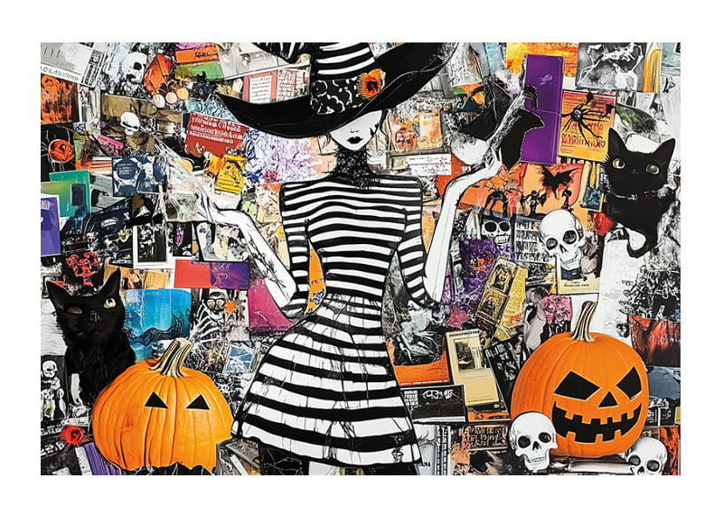 This poster captures an atmospheric witch fantasy with a mix of collage and Halloween elements. An elegant witch in a striped dress stands surrounded by cat figures, pumpkins and various colorful stickers that evoke a sense of mystery and festivity.