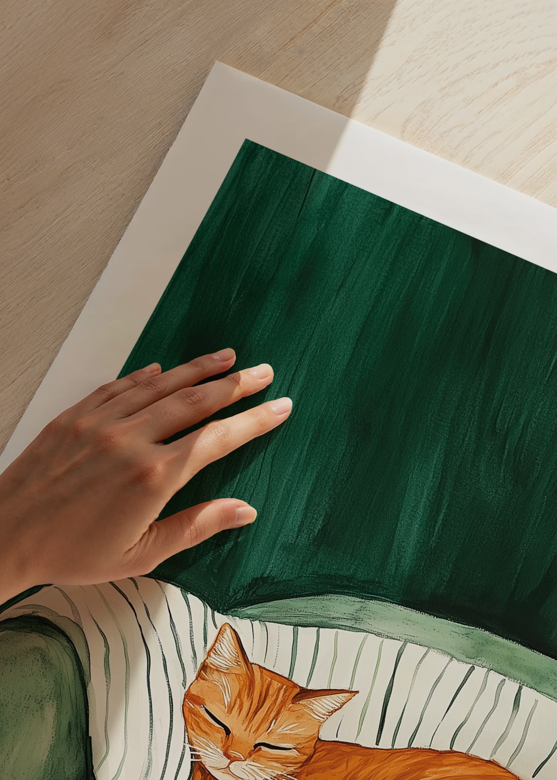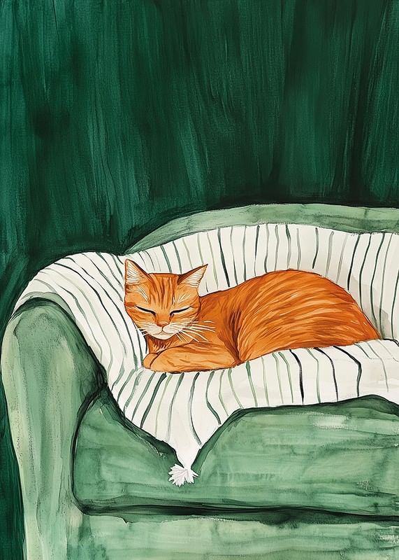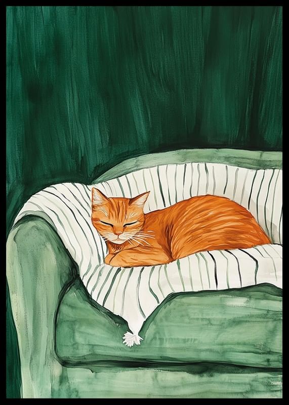 A charming poster that captures a sleeping orange cat, comfortably nestled on a striped blanket in a green armchair. With warm and calm color tones, the motif creates a harmonious and relaxed atmosphere, perfect for giving your home a homely and peaceful feel.