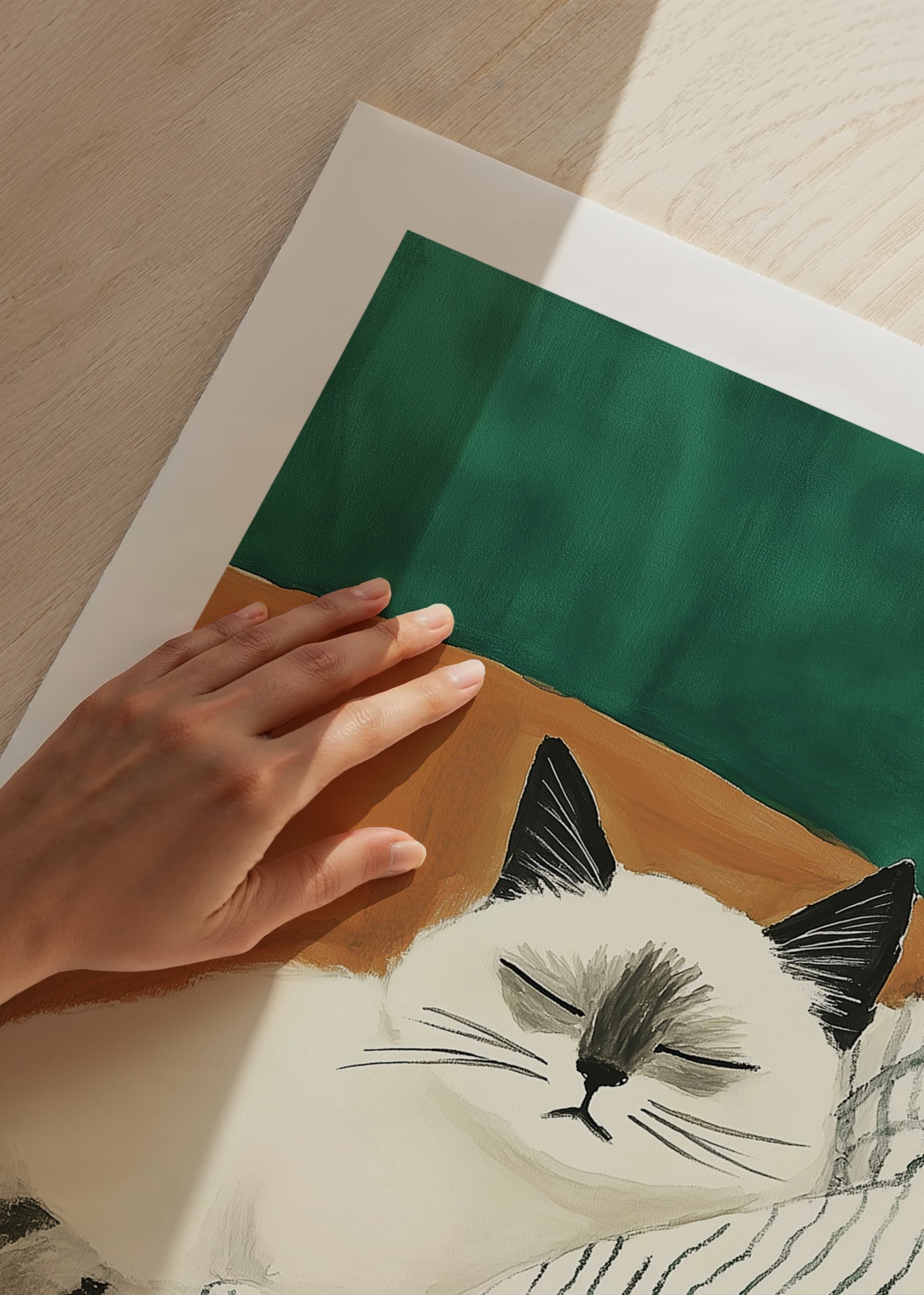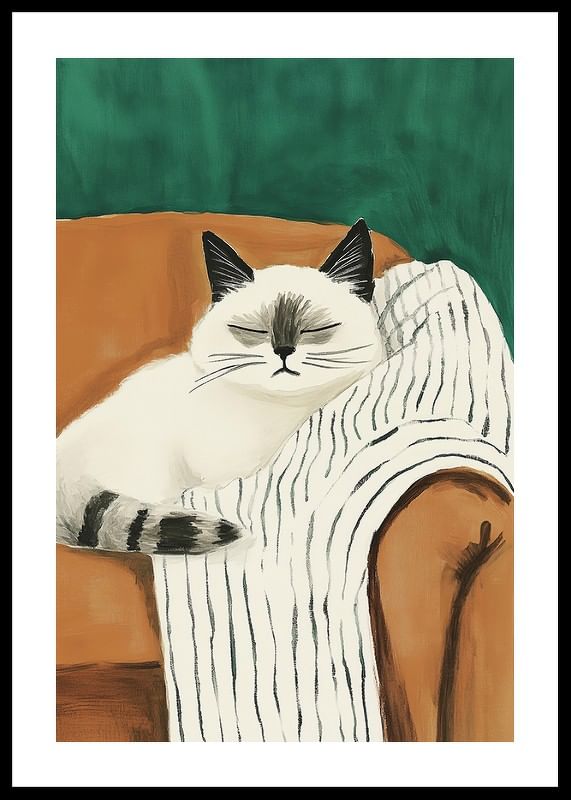 A charming poster showing a relaxed cat resting on a soft, striped blanket in a warm orange armchair. With harmonious colors of green, white and brown, the motif creates a calming and homely feeling.