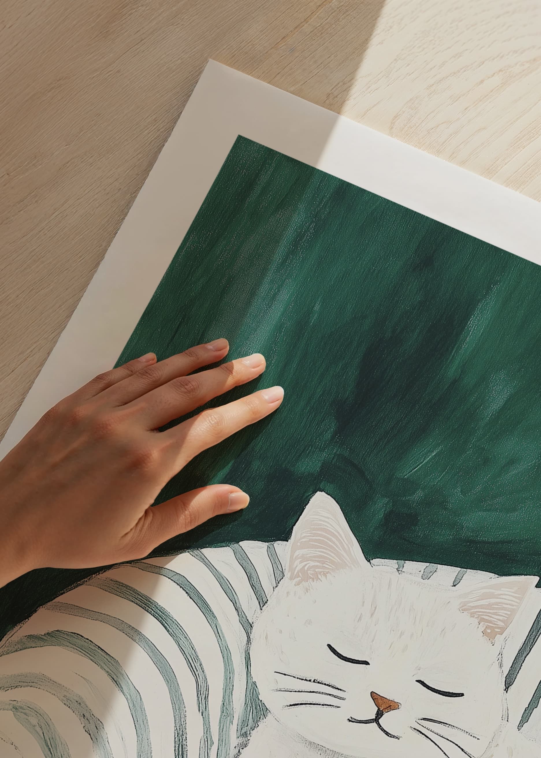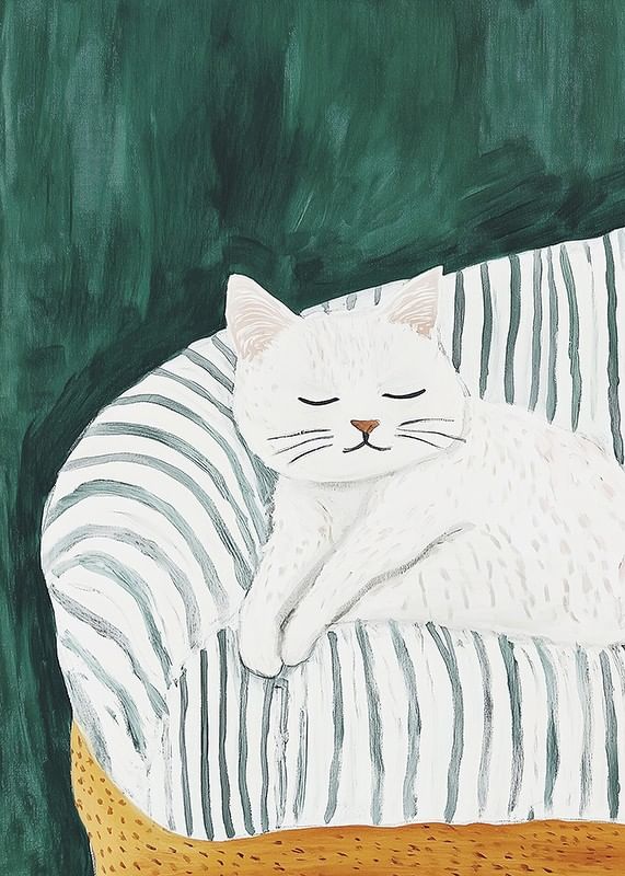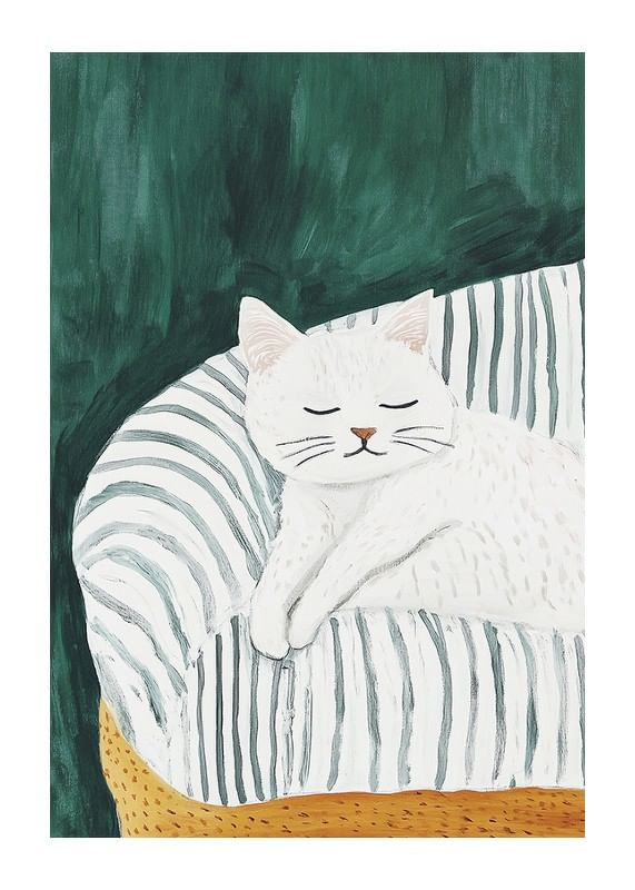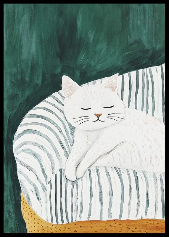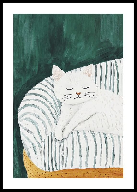 A calming poster depicting a white cat deep in sleep on a soft, striped blanket in a warm, golden armchair. The harmonious colors of green, white and yellow create a calm and homely atmosphere.