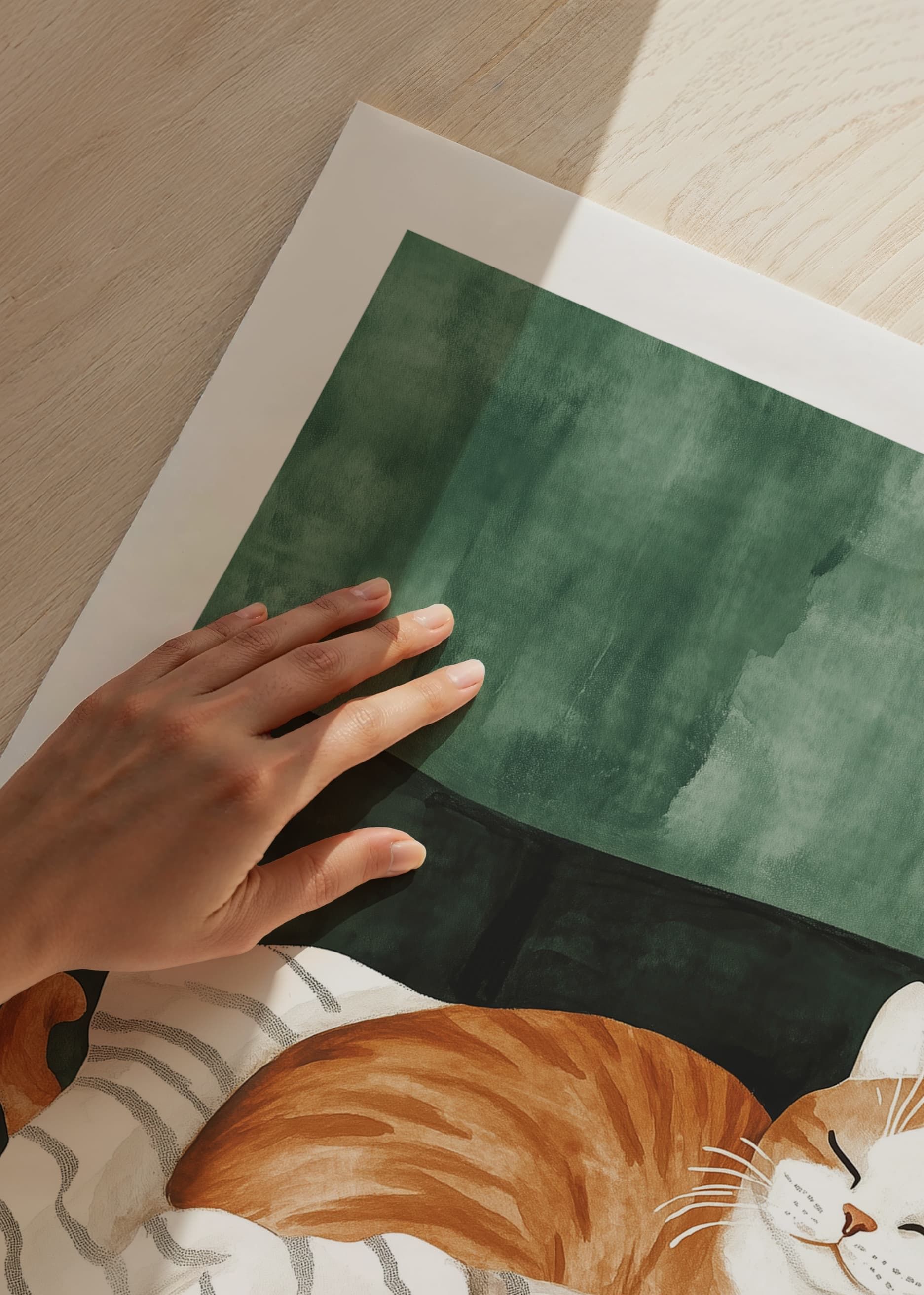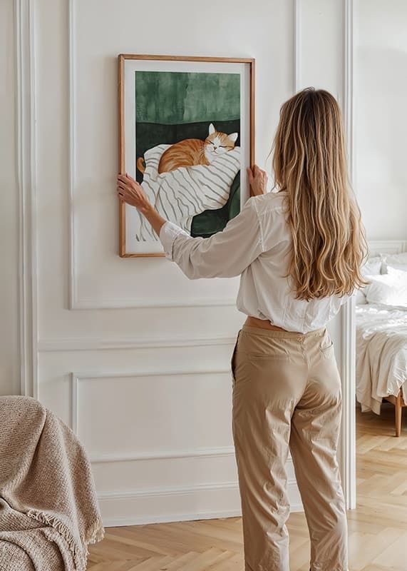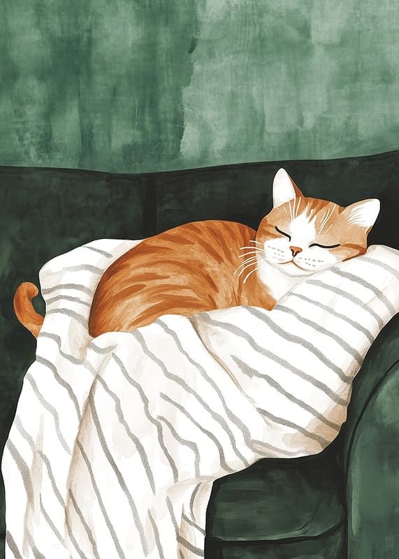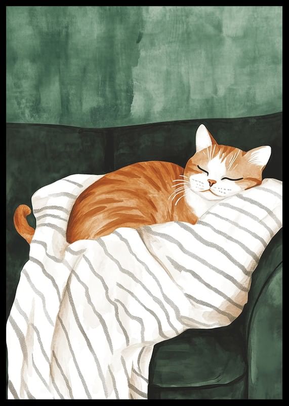 This charming poster depicts an orange cat sleeping peacefully on a soft, striped blanket in a dark green armchair. The warm tones and detailed brushstrokes create an inviting and homely feel, perfect for giving your home a cozy and peaceful atmosphere.