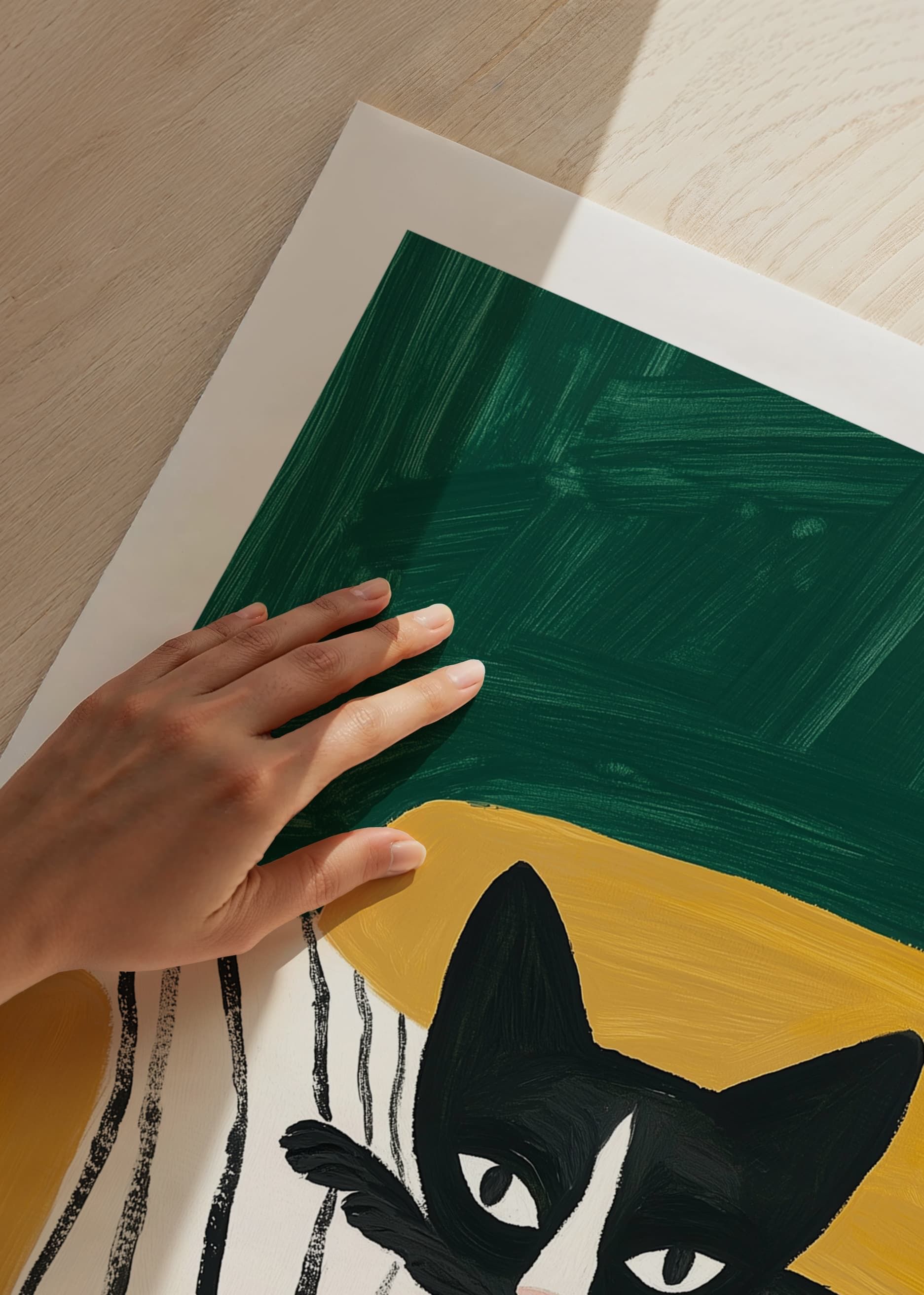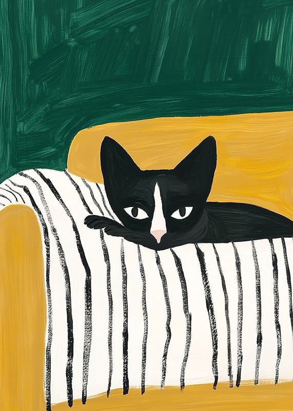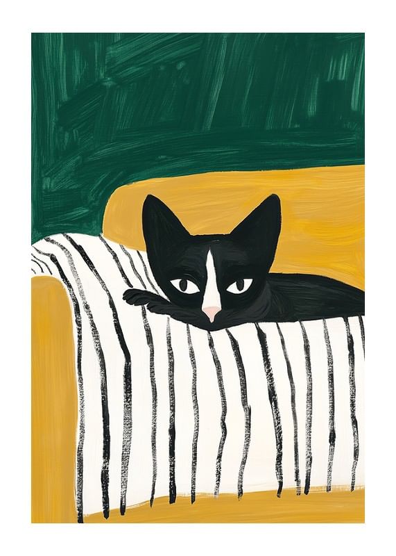 This stylish poster depicts a black and white cat with a curious look, resting on a striped blanket in a mustard yellow armchair. The bold color contrasts and simple lines create a modern and playful feel, perfect for giving your home a personal and artistic touch.