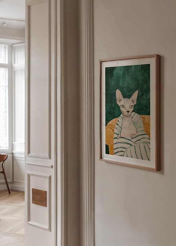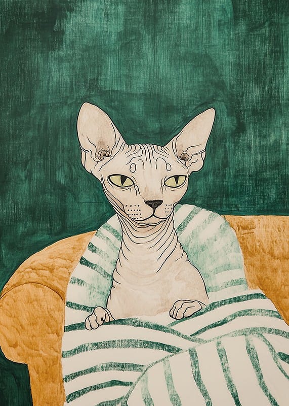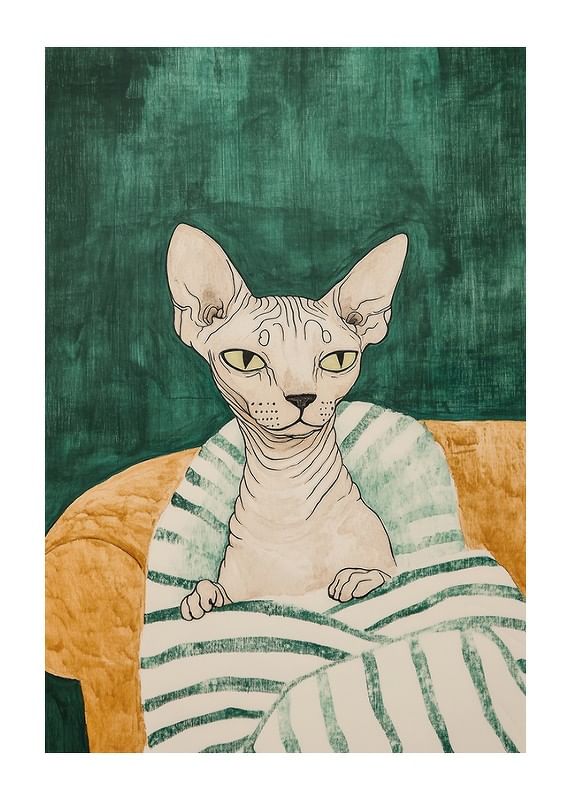 This unique poster depicts a majestic Sphynx cat wrapped in a striped blanket, resting in a mustard yellow armchair against a deep green background. The crisp lines and subtle color tones create a modern and sophisticated feel, perfect for adding an artistic and stylish touch to your home.
