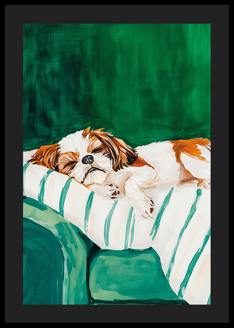 This charming poster depicts a small dog sleeping peacefully on a striped blanket on a green sofa. The warm colors and calm atmosphere create a sense of harmony and homeliness, perfect for giving your home a cozy and relaxed atmosphere.