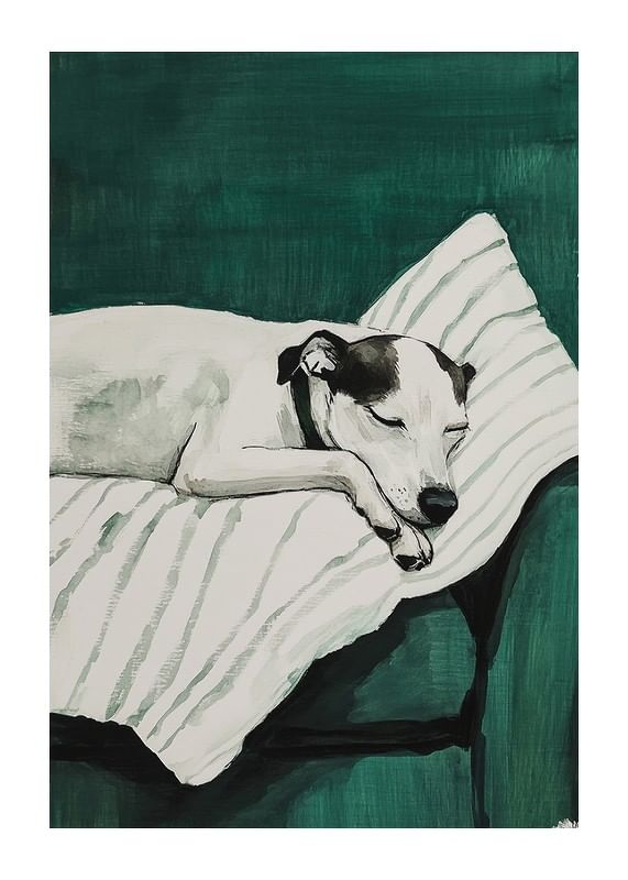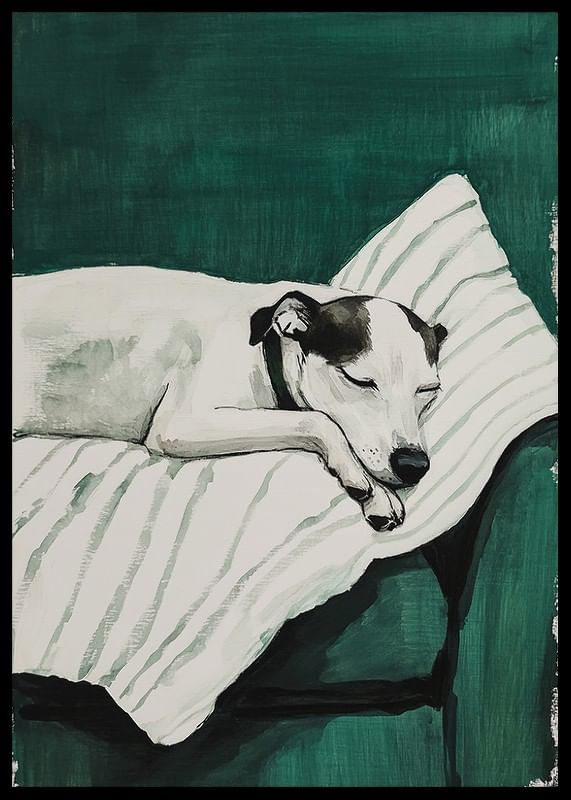 This stylish poster depicts a sleeping dog resting peacefully on a striped blanket on a deep green sofa. The harmonious color palette and calm atmosphere create a soothing and homely feeling.