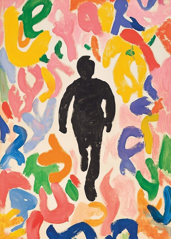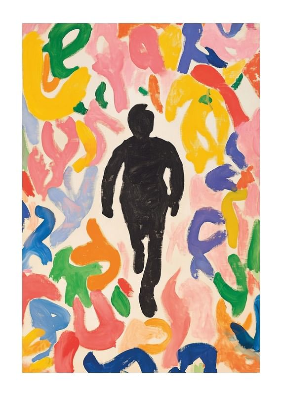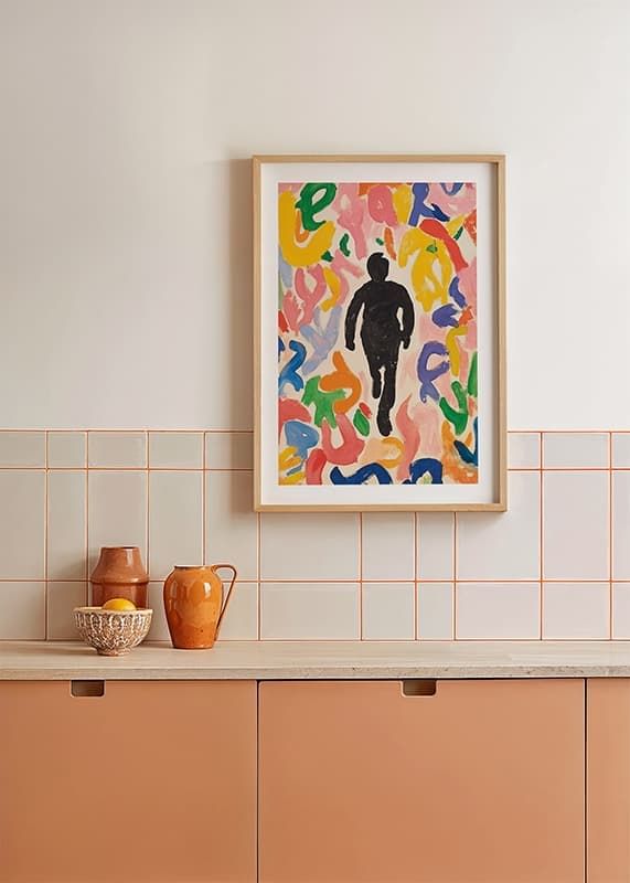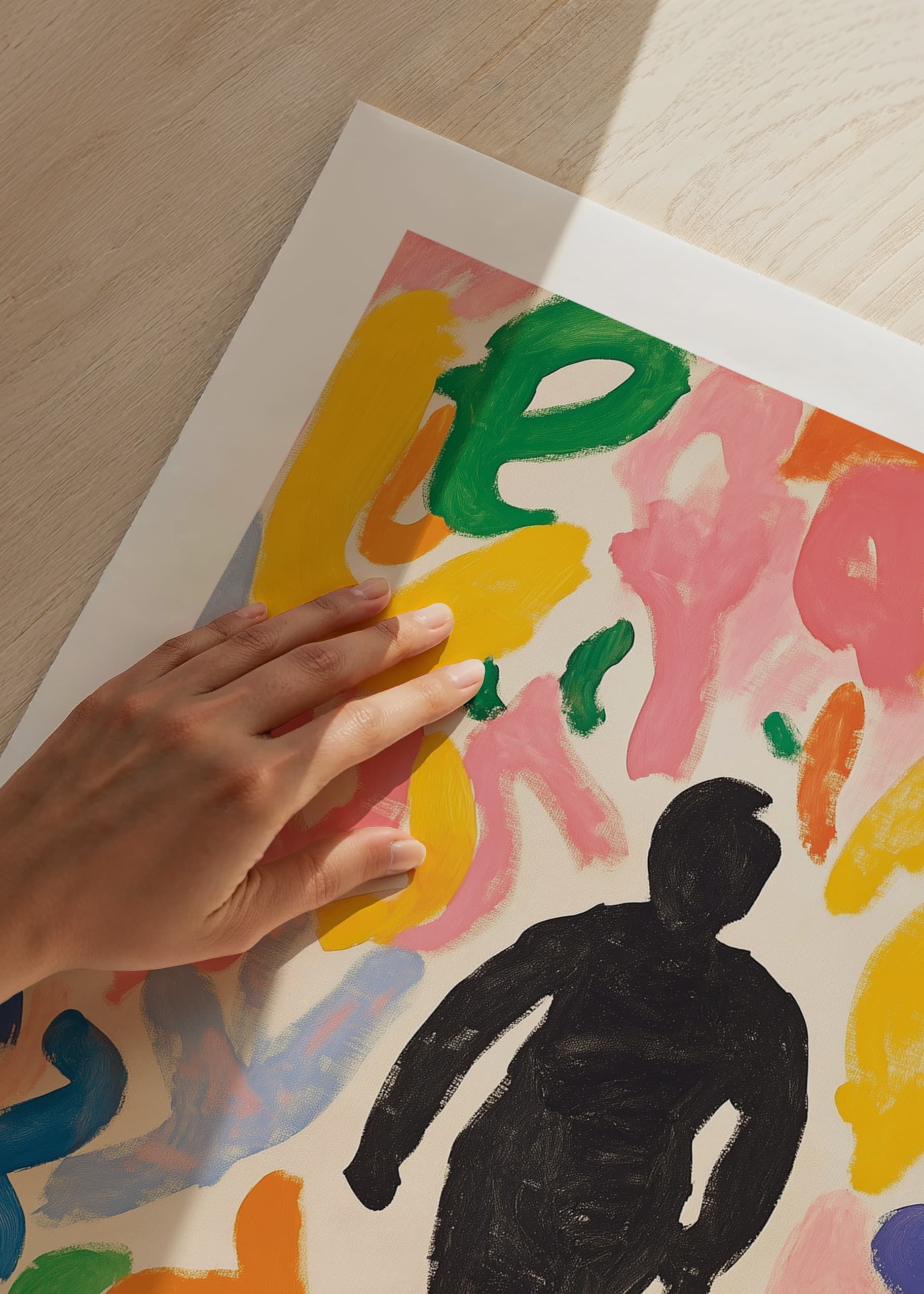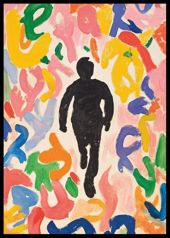 Elevate your home with this dynamic and colorful poster! A dark silhouette in motion is contrasted with an explosion of vibrant colors and abstract shapes. The artwork symbolizes movement, energy and self-expression, perfect for giving your room a modern and inspiring touch.
