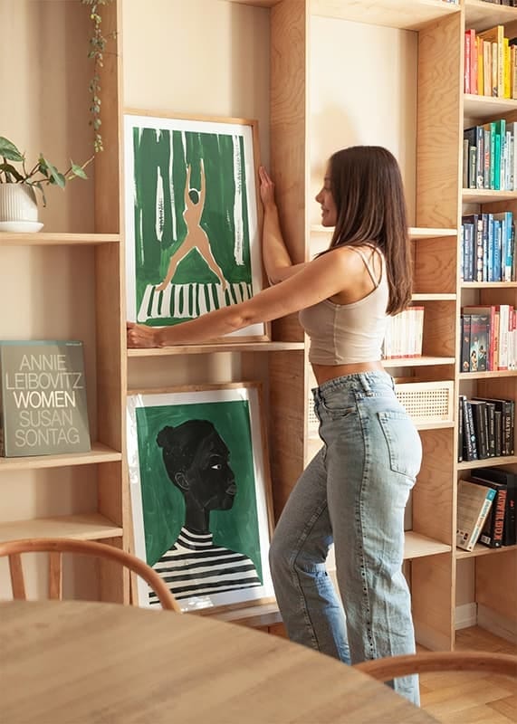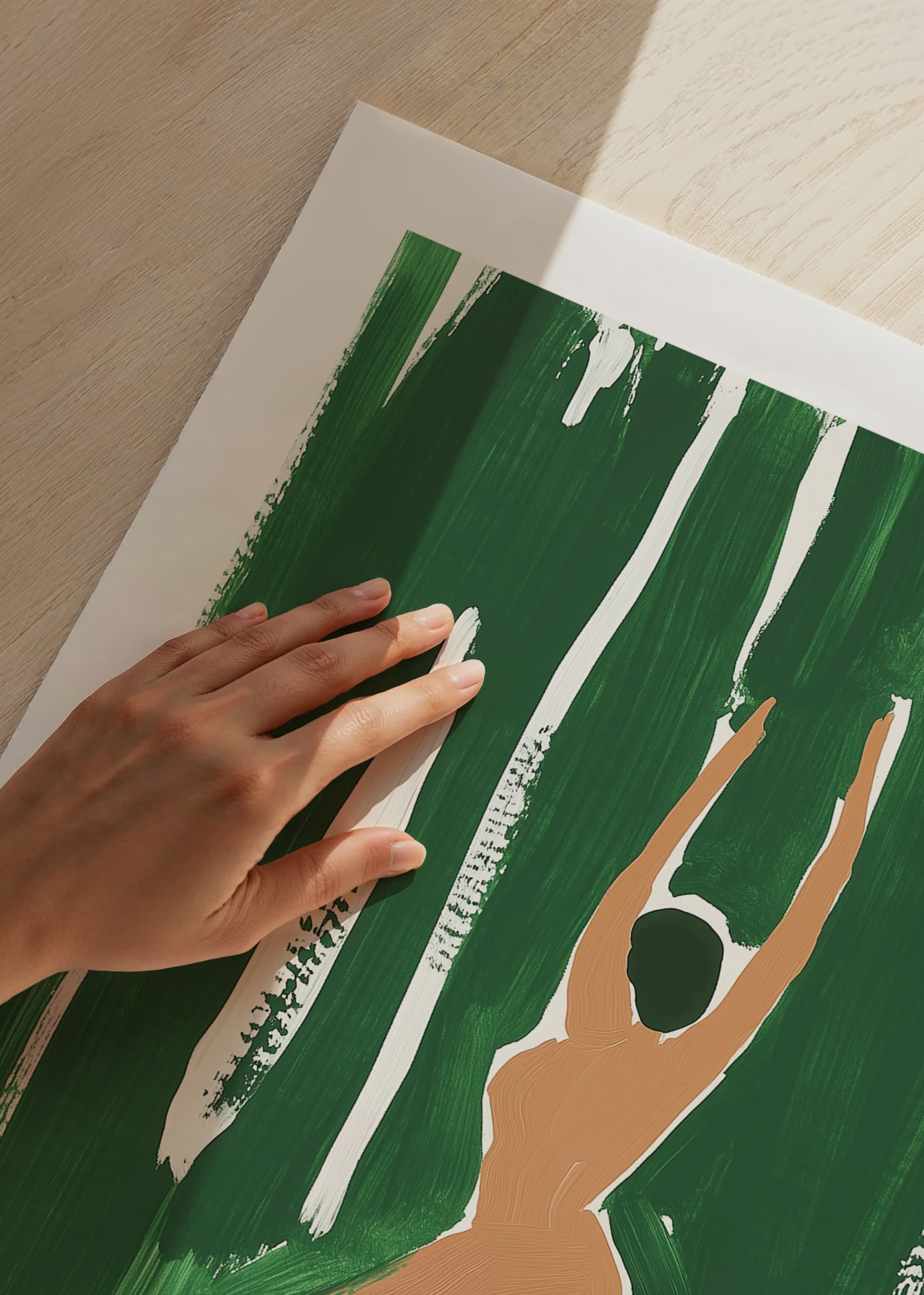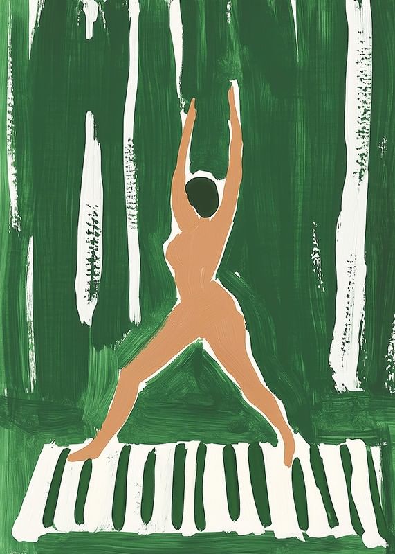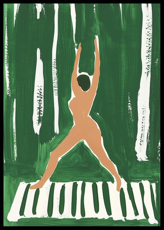 This inspiring poster depicts a woman in a powerful yoga pose with her arms stretched towards the sky, surrounded by a deep green background. The simple, expressive brushstrokes and earthy tones create a sense of strength, balance and inner peace.