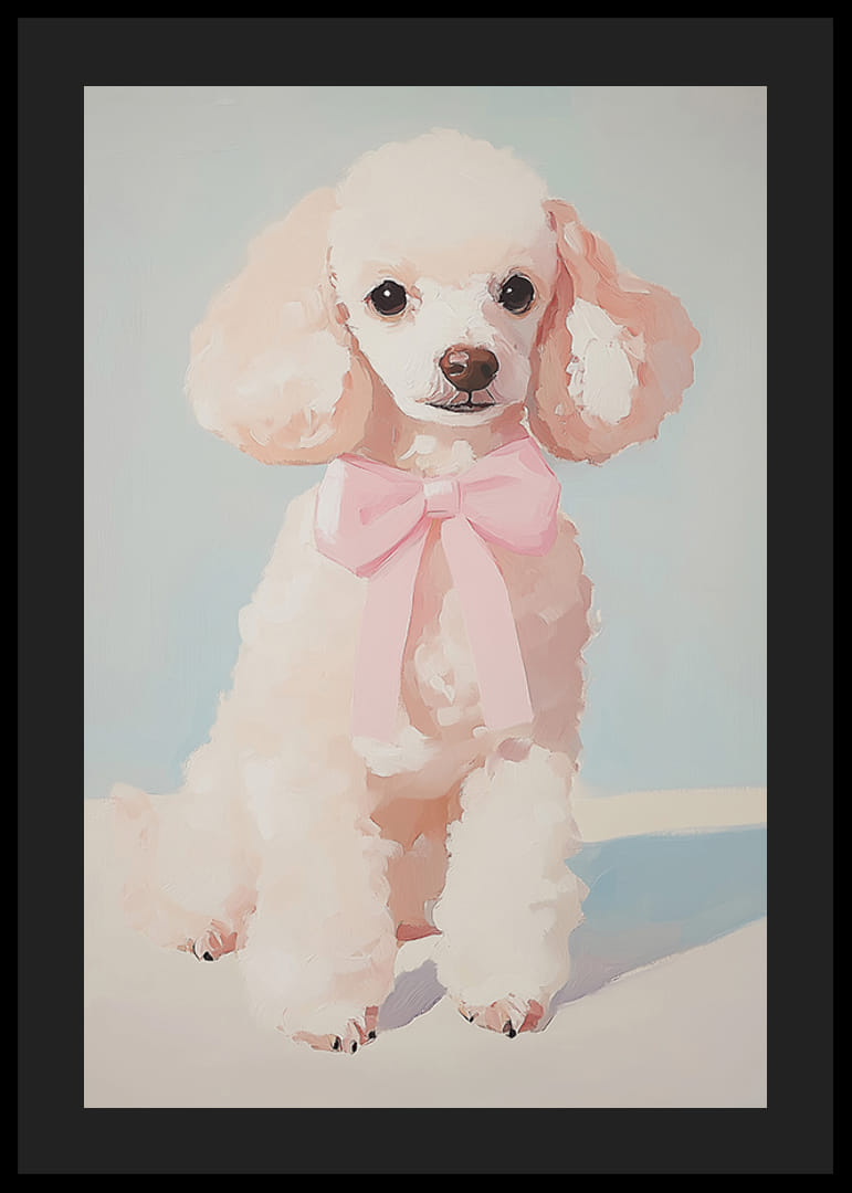 This adorable poster depicts a cute poodle with fluffy fur and a big pink bow around its neck. The soft, pastel-colored painting exudes warmth and charm, perfect for brightening up any room.