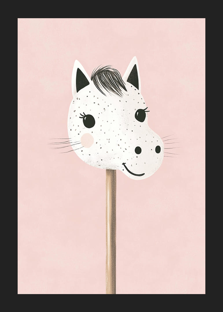 This playful poster depicts a charming stick horse with a white, spotted muzzle and a happy smile. The soft pink background and simple details give a warm and nostalgic feel, perfect for a child's room or as a sweet gift for little horse lovers.