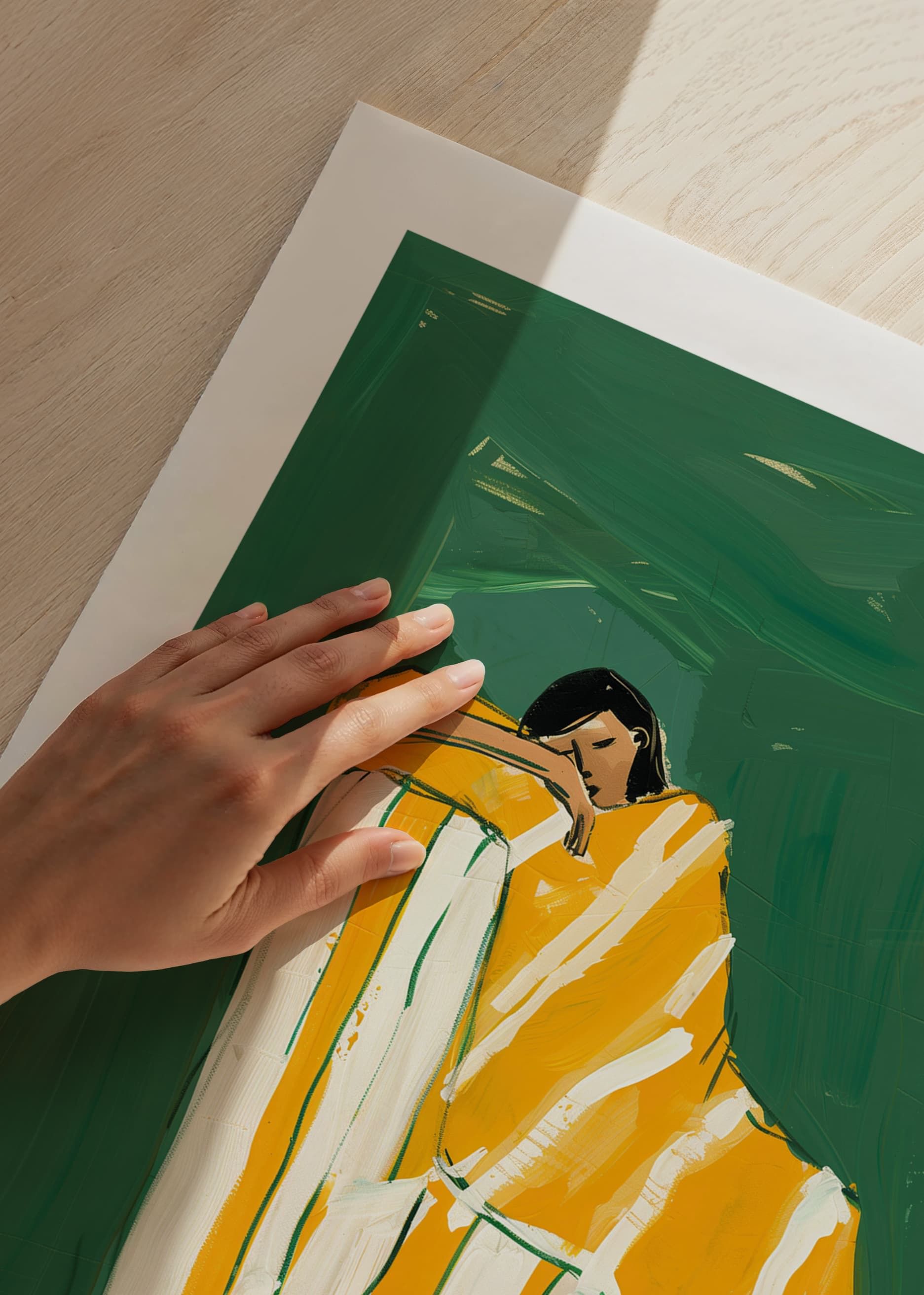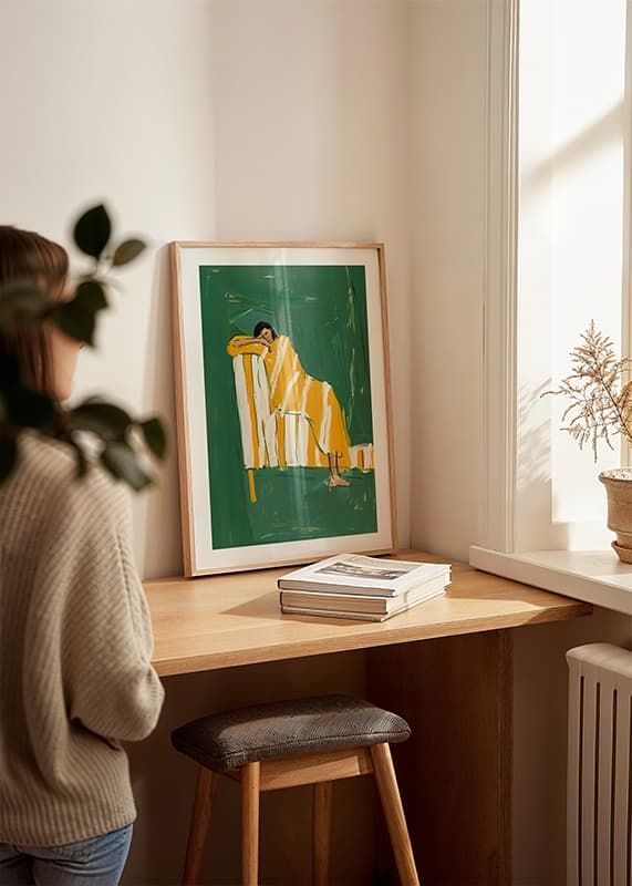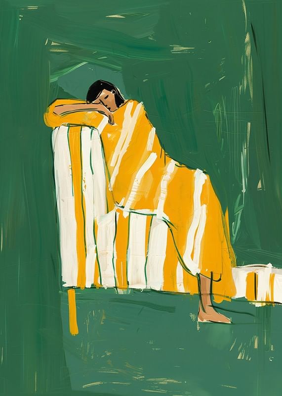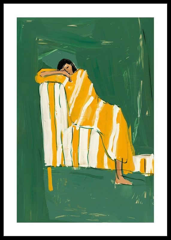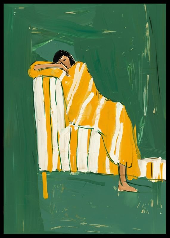This stylish poster depicts a person wrapped in a yellow-striped blanket, resting their head on the back of a sofa against a deep green background. The simple lines and warm colors create a sense of calm and rest.
