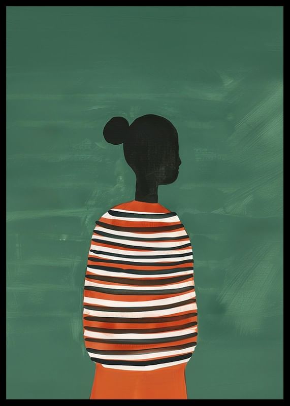 This modern poster depicts a stylized silhouette of a person in profile, wearing a colorful sweater with black, white and red stripes against a deep green background. The clean lines and strong color contrasts create a harmonious and contemporary feel.