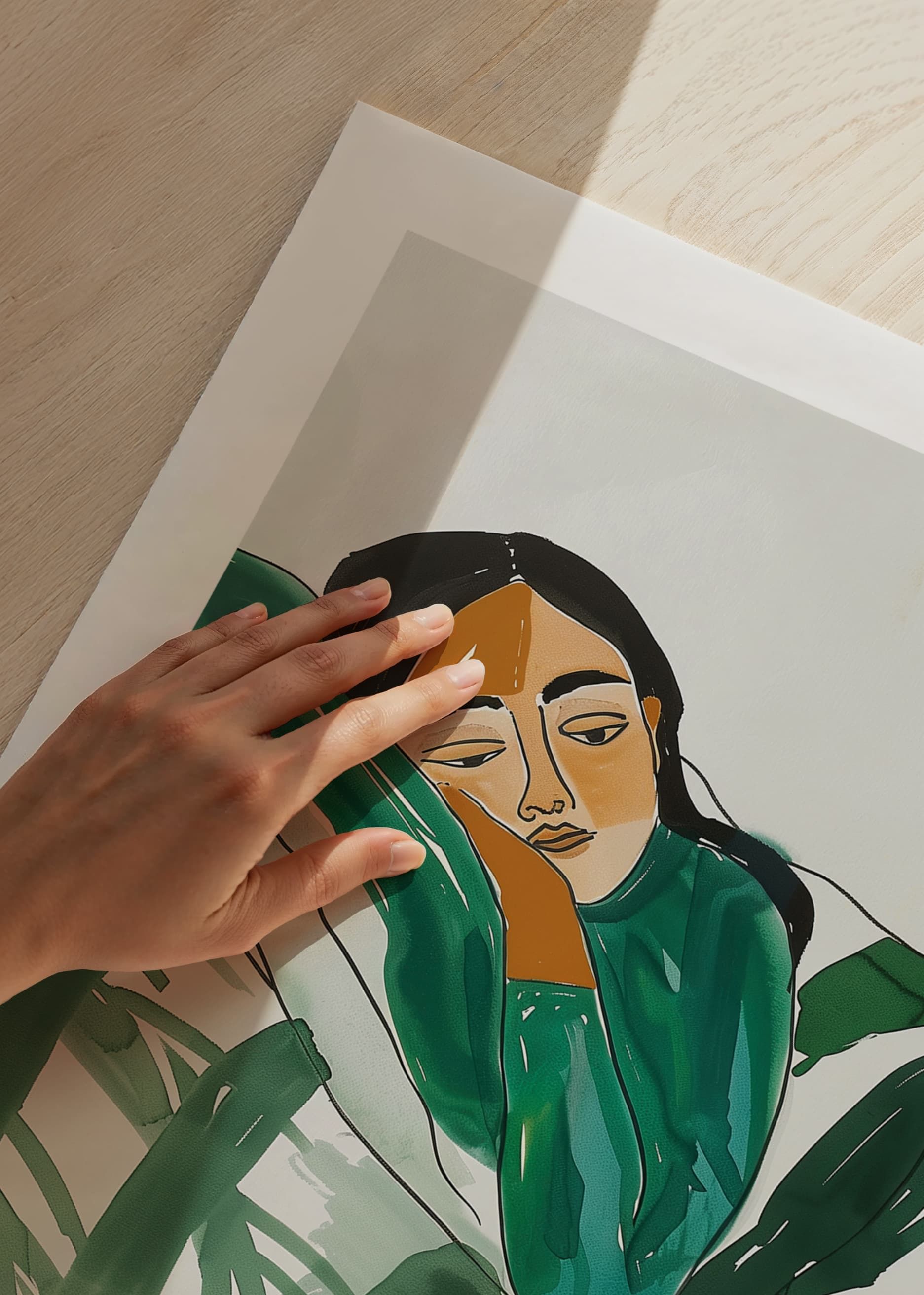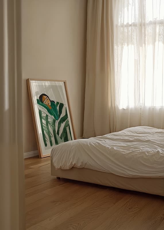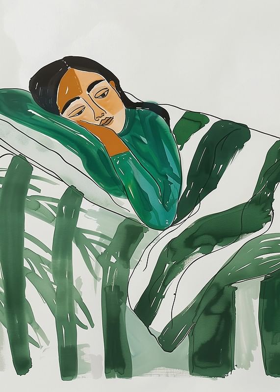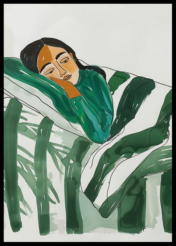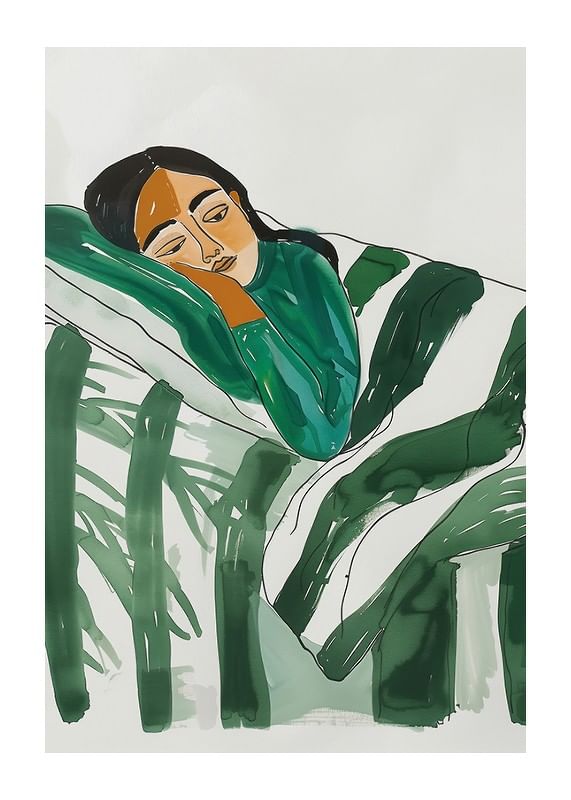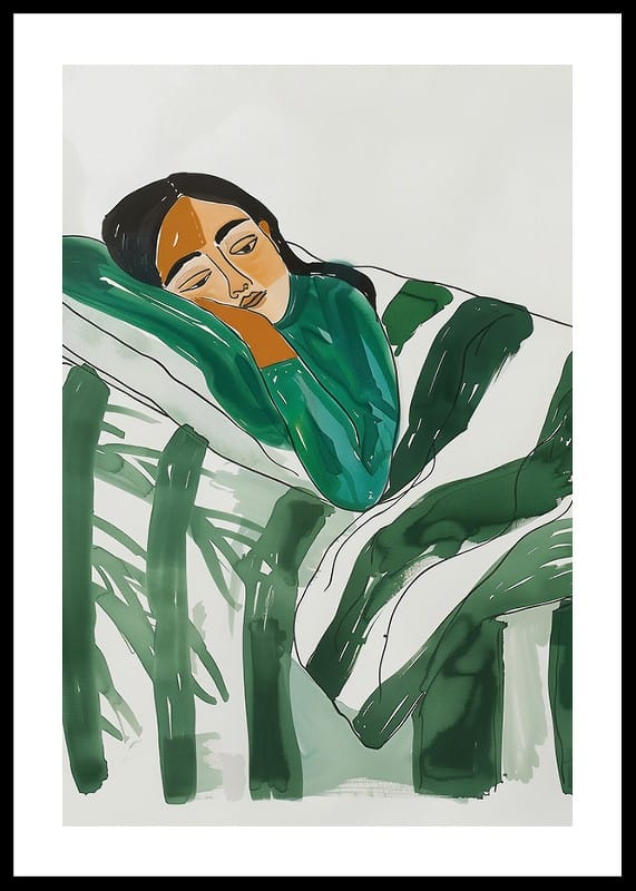 This serene poster depicts a woman resting her head on a pillow, wrapped in green and white textiles. The soft, flowing brushstrokes and harmonious colors create a sense of calm and contemplation.