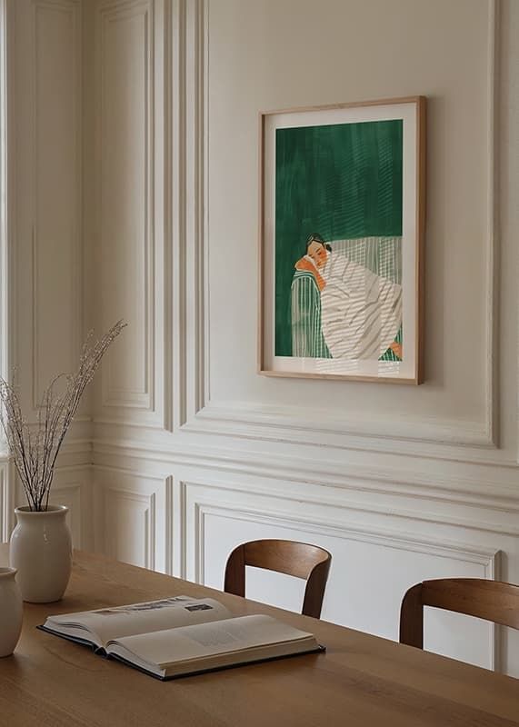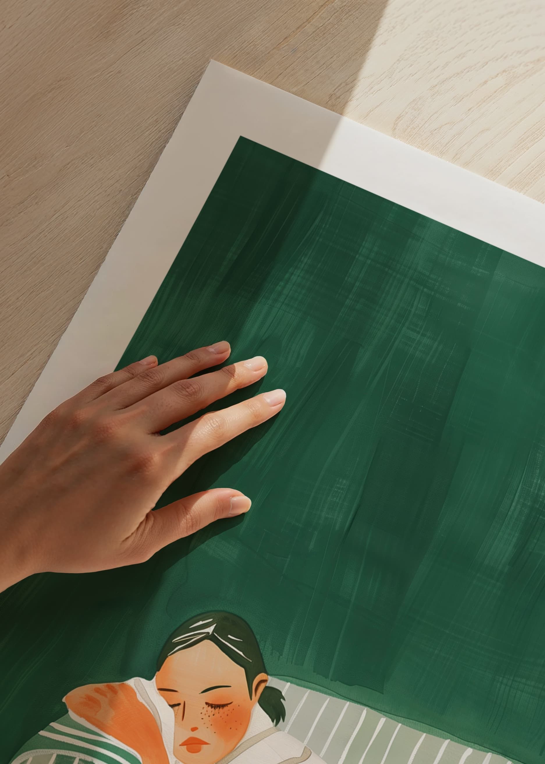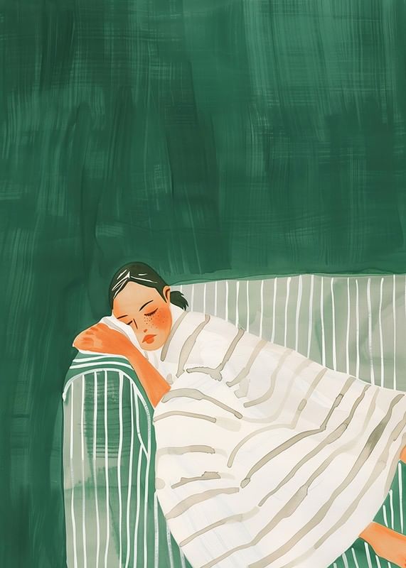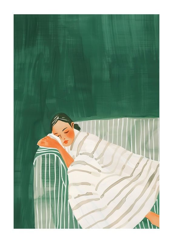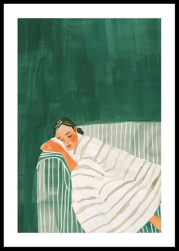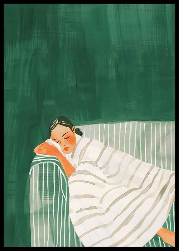 This beautiful illustration captures a peaceful moment of rest. A woman, wrapped in a soft blanket, sleeps peacefully on a striped sofa, surrounded by harmonious green tones. With soft brushstrokes and a warm color palette, the poster creates a sense of security and relaxation.